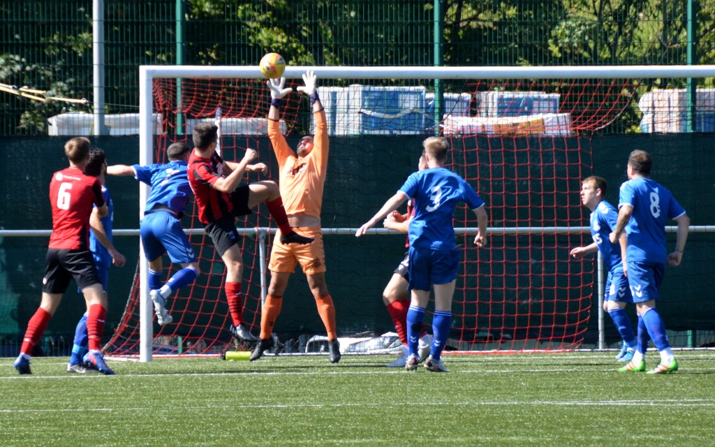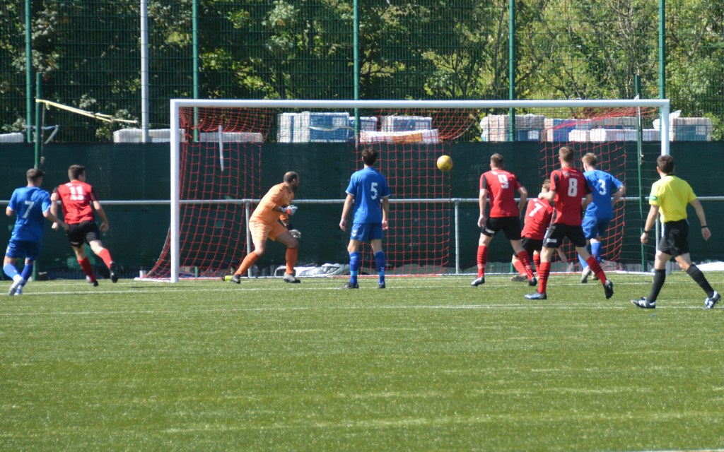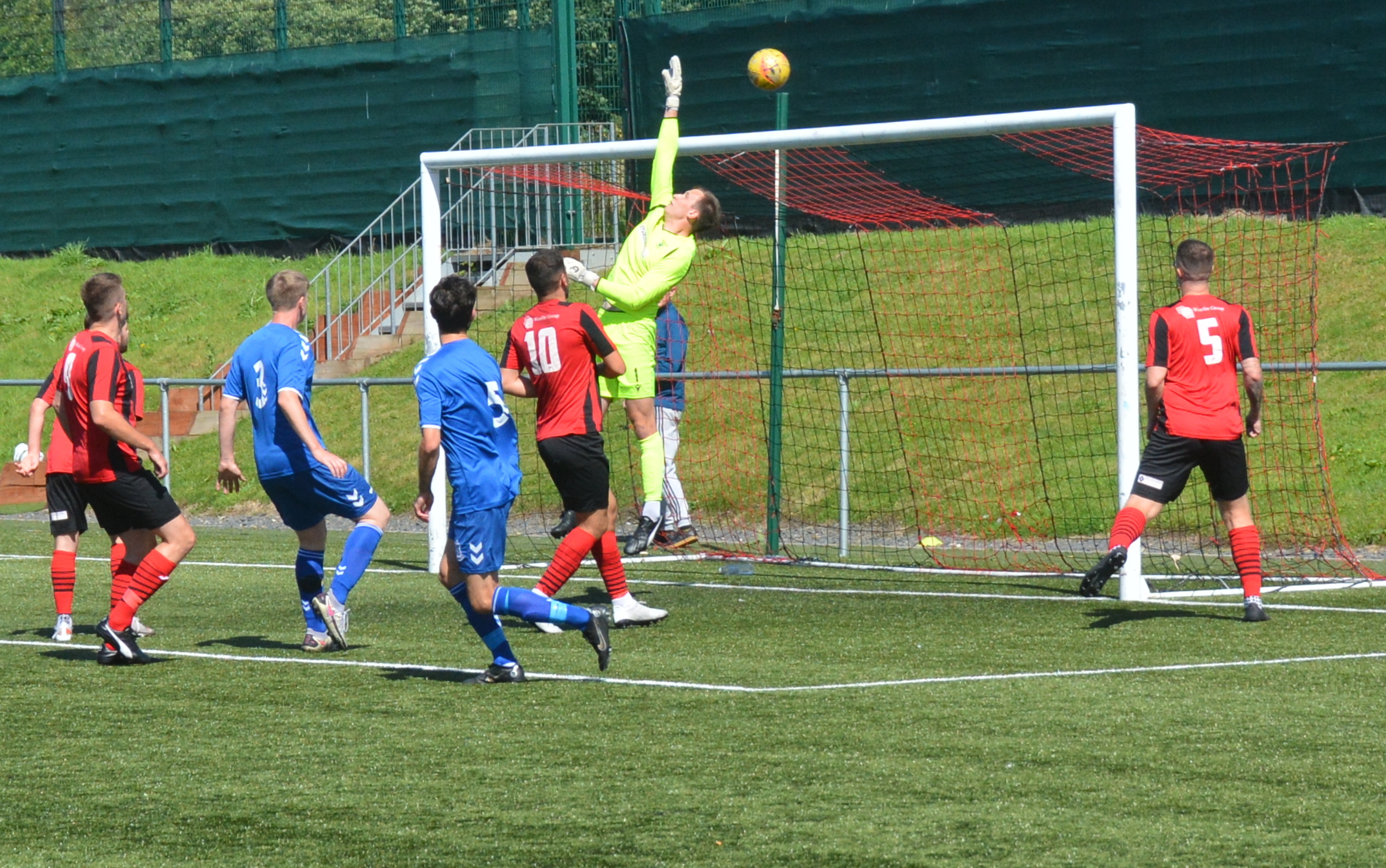 Bonnyton started brightly and forced a couple of corner kicks in the opening 5 minutes. The first came after Stewart Davidson’s shot from the edge of the box was deflected wide and although the kick was met at the back post by Kyle McAvoy the loose ball was cleared by Pettigrew. Back came Bonnyton with Craig Patterson bursting through the middle before playing a one-two with Taylor Allan to set up a shot that was deflected wide too. After some head tennis in the box, keeper David Markey clutched the ball safely from under the bar.