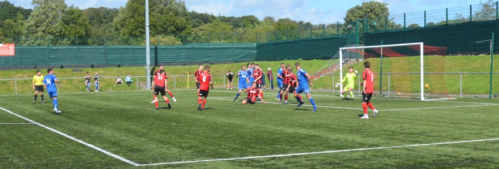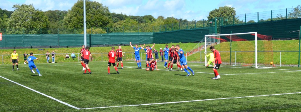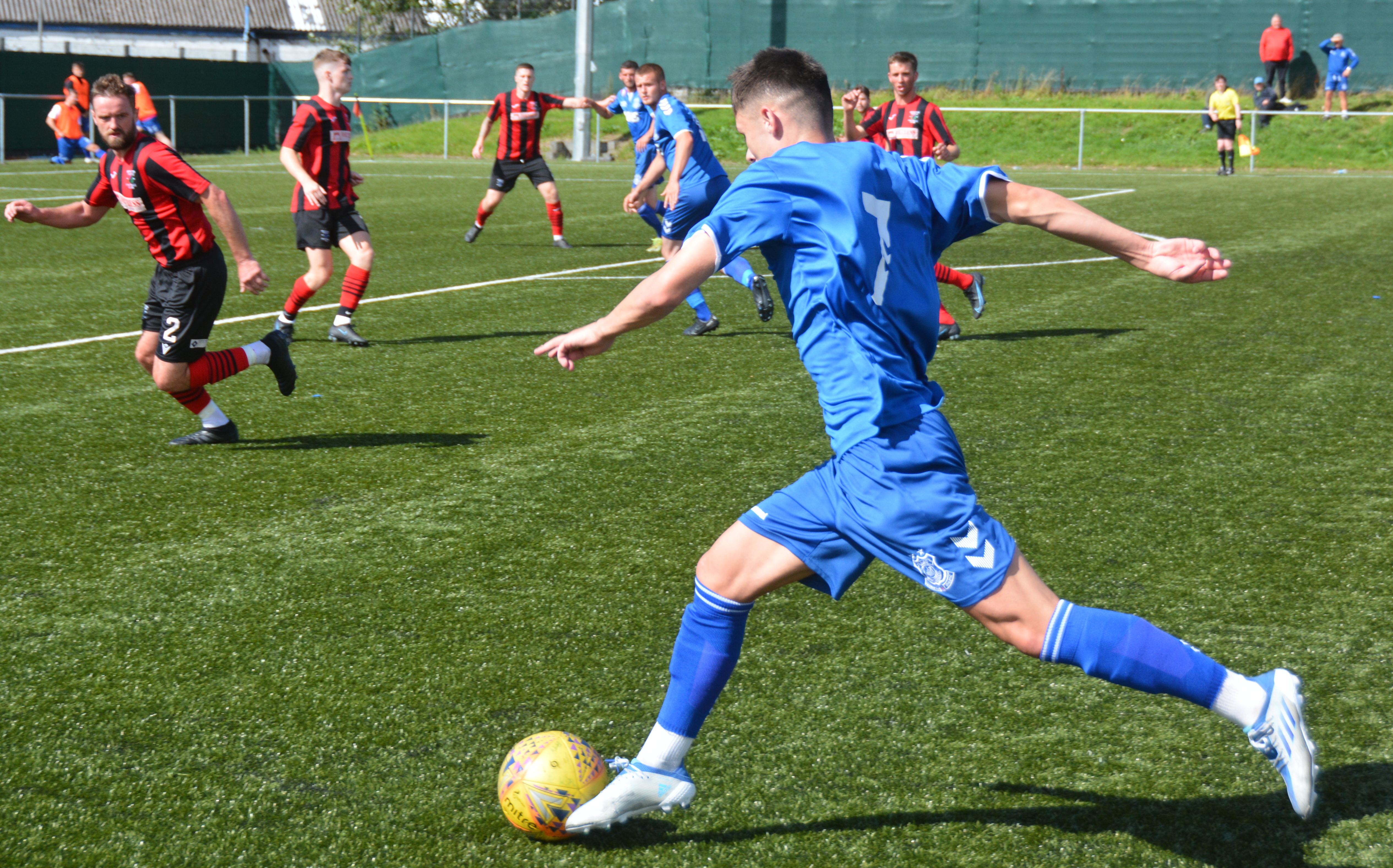 The deadlock was broken on 21 minutes. Paton intercepted Duffy’s forward pass in the Glens’ half of the centre circle and quickly dispatched the ball down the right wing for McKee, with Duffy back-tracking in hot pursuit, while the McKenzie brothers were breaking into the box. McKee, now about 12 yards from the goal-line and a couple yards from the edge of penalty box, however his cross was cut-out by Duffy’s raised arm a foot outside the box earning the defender a yellow card and the Glens a free kick. The visitors packed the box with their back three and front two seemingly, to challenge for Paul Paton’s free kick, only for the midfielder to roll a perfectly weighted ball into the ‘D’ for the incoming David Blyth to drill a low shot from 18 yards that took a deflection before bulging the net.