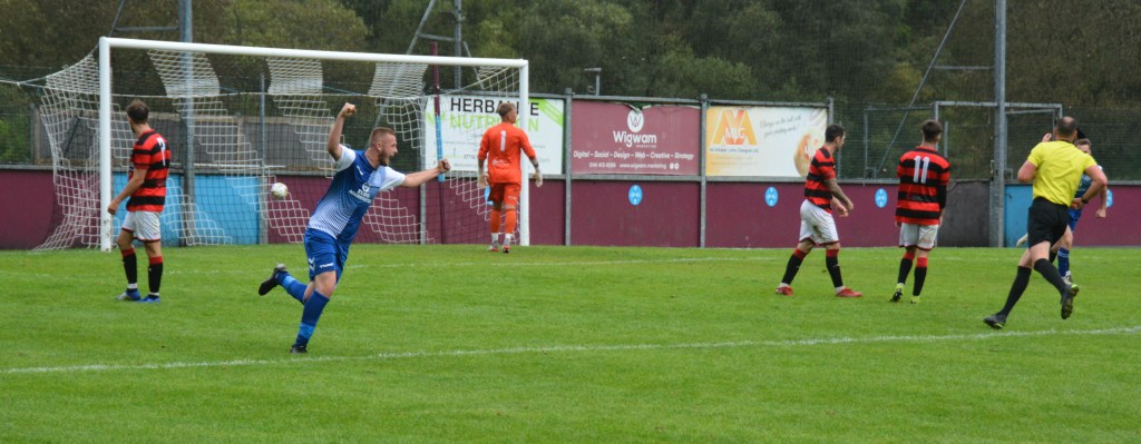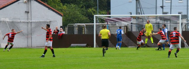 Murphy rolled the ball out to McKernon triggering an exodus of blue shirts breaking in unison upfield. As Jambo reached the half way line, on the edge of the centre circle, he hit a diagonal forward pass for Kemp to chase while Murphy continued his run through the middle. Kemp then picked out McKenzie on the outskirts of the left-hand side of the box and as Baber caught up he threaded a perfectly weighted ball between him and the static Walker for the incoming Leon Murphy to slide in and guide the ball home with the sole of his boot between keeper and post from 8 yards out. Cue ecstatic celebrations. Glens 2-1 up on 76 minutes.