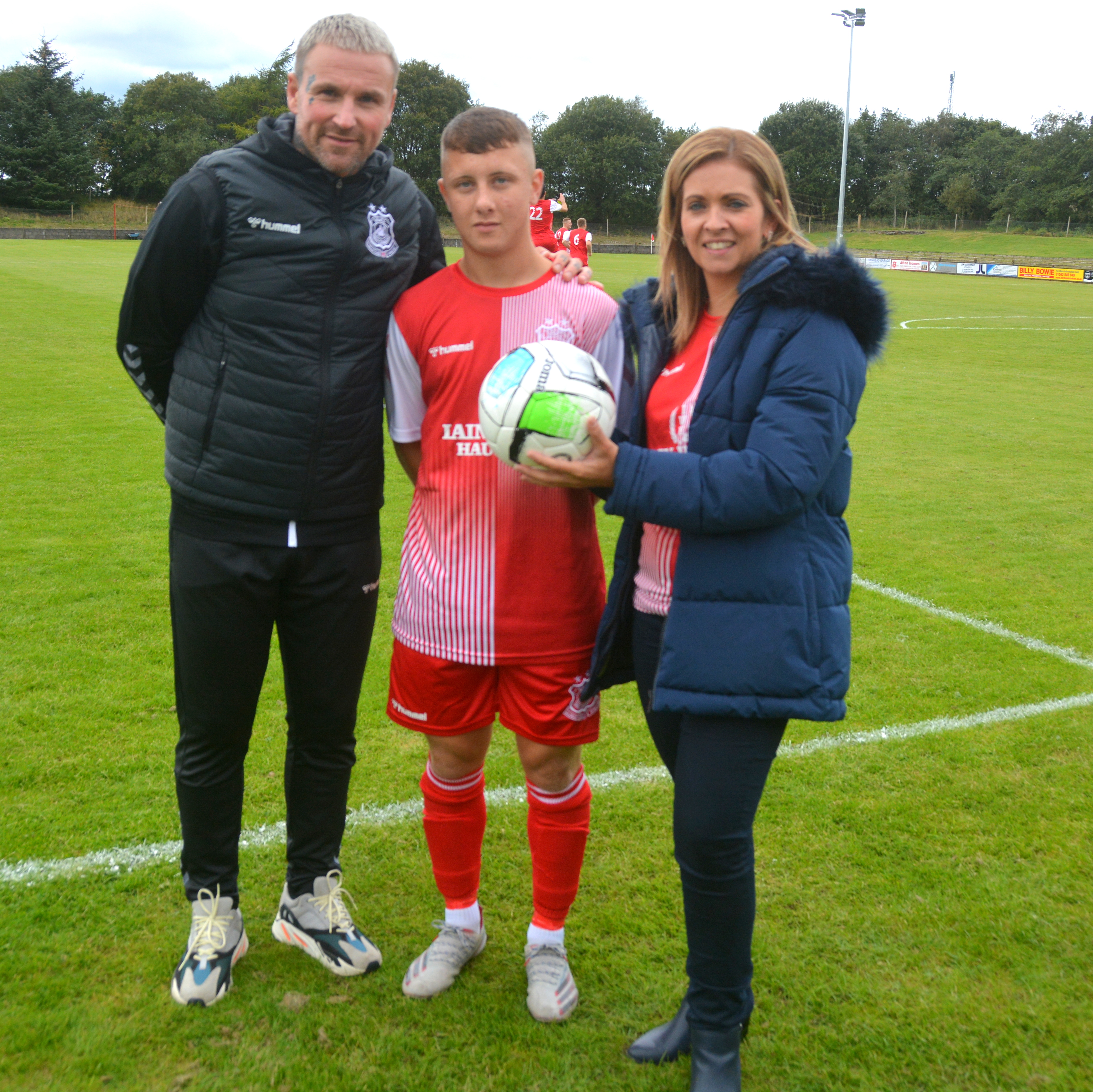 Manager Ryan Stevenson posed with match ball sponsor Lynne Gemmell and her son Glenafton striker Dylan O’Kane – many thanks to Lynne for her support.