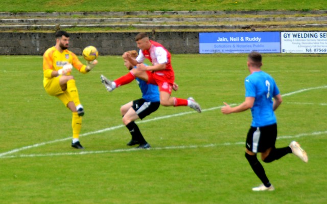 Back came Glens through McKernon robbing Moore of the ball with a crunching tackle and Kemp snapped up the loose ball before returning it to Jambo who drilled a low angled shot from 20 yards only for Burgess at full stretch to stop the ball with one hand before grabbing it with both.