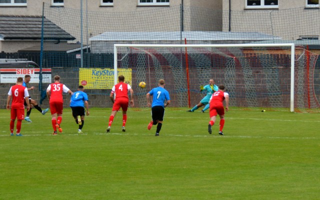 The visitors then won a free kick just inside the Glens half and McCloskey looked set to launch a high ball into the box but instead played a long pass to Moore on the edge of the right-hand side of the box. From here he cut inside to pick out B Black on the edge of the ‘D’ who quickly threaded a pass to Stephen Wilson on the left-hand side of the box to clip a high cross to the near post where Gilroy, Ross and Markey all challenged for the ball, with the keeper punching it higher still into the air and as it dropped B Black headed it over the bar before he tumbled to the ground under pressure from Paton and Ross. Deemed dangerous play by the referee who quickly pointed to the spot and Stephen Wilson duly dispatched the ball past Markey into the top right corner of the goal to put Troon in the lead on 20 minutes.