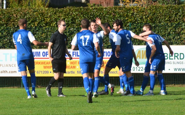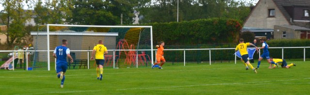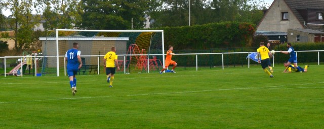 A huge dark cloud began to drift over Forgue Park as Calvin Kemp whipped a dangerous ball from the right flank to the far post where Murphy sneaked in behind Scott Chalmers to try and guide the ball home from the corner of the six-yard box only for the keeper to fall to his knees and stop the ball with both hands at the base of the post while Chalmers was content to boot the loose ball behind as O’Kane threatened. McKernon’s kick was met at the far side of the box by Ollie Rowe who powered a header goalward that keeper Milne stopped with a strong hand and Ryan Walker hoofed it clear to set up a counter attack that fizzled out.