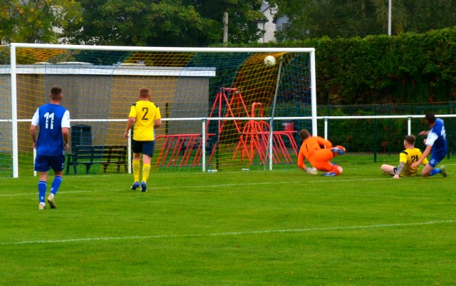 Two minutes before the break the Glens doubled their lead. Rowe on the right, just inside the Glens half, launched a high ball into the box which took a bounce before Sean McKenzie killed it on his chest and then twisted and turned to shake off Wood before flicking the ball up and then as Ryan Walker closed in, lashed a shot from 7 yards out that the keeper could only deflect into the roof of the net.