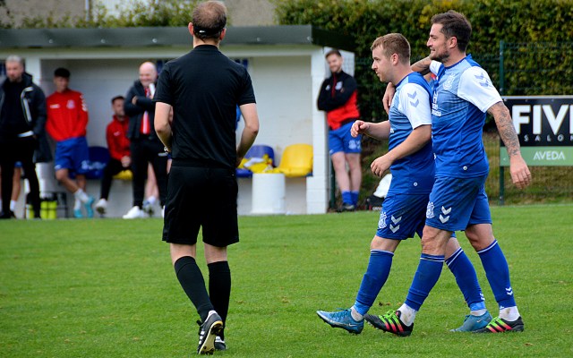 After surviving some seven minutes of intense pressure Glenafton broke the deadlock on 23 minutes against the run of play, it’s fair to say. Down the left McKernon returned a short throw to Murphy who whipped a glorious ball to pick out Adam Caldwell’s run into the far side of the box who then took a touch before slipping a short pass to Paton who in turn back-heeled the ball with his right foot before Kyle Walker’s slide tackle whipped the left leg from him. However, as Caldwell claimed for a penalty Dylan O’Kane pounced on the loose ball and kept his cool to fire a low shot, as both Wood and Chalmers tried to block the ball with outstretched legs, which whizzed past the keeper on the line for the young striker’s first goal for Glenafton. Glens 1-0 up.