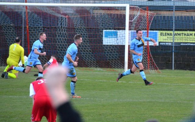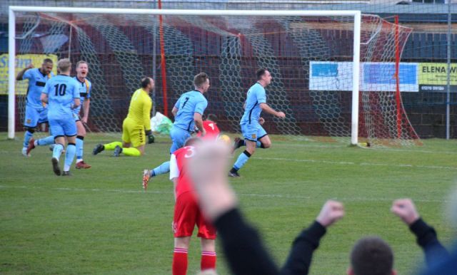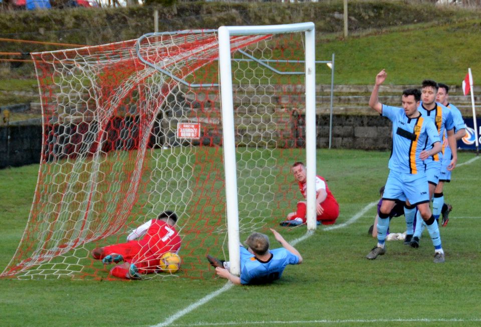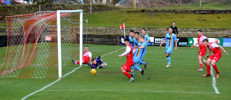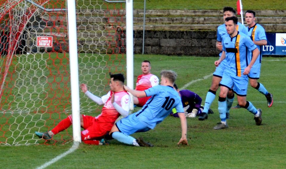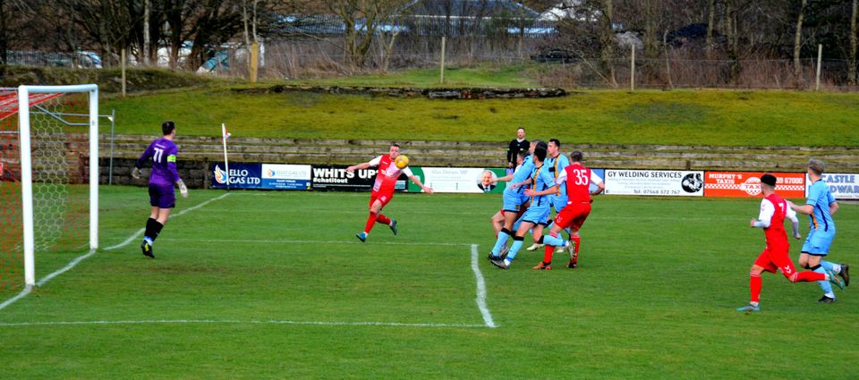 Play then got bogged down for a period and it was Marks on 15 minutes that had another pop at goal from inside the box after picking up a pass from Nathan Wade but this time he his shot flew high and wide of the target. Nevertheless, it sparked a good spell of pressure from the visitors. Andy Duffy on the right clipped a high ball to the back post where Dean Currie got the better of Marks in the aerial battle to head clear. Ladeside recovered the ball and won back-to-back corners, the second of which keeper David Markey punched clear from the head of Marks. A long throw from the right was chested down by Dallas in a packed box but Jamie McKernon pounced to clear the danger.