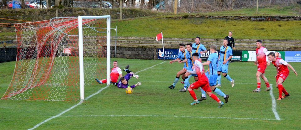 Play then raged back and forward with each side coming close to adding to their tally. On 43 minutes McKee from wide on the right clipped a ball high into the six-yard box where Kerr leapt between two defenders sending a glancing header towards the back post to fall kindly for McMullin and looked certain to score from 2 yards out only to send it wide of the other post.