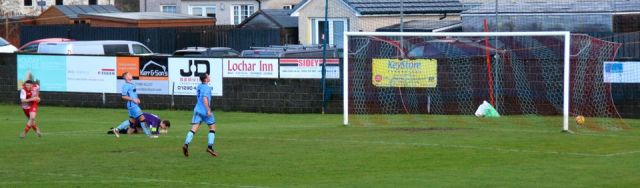 Markey launched a high ball down the left for McMullin only for the leaping Duffy to climb all over him and concede a free kick about 30 yards from goal. Both sides lined up 5 players along the 18-yard line and as Paton floated the ball to the far side of the six- yard, Kemp was first to peel off the line and square the ball past the keeper along the face of the goal where Sam McKee got the jump on a handful of defenders to knock the ball over the line from a yard out with Ross McKenzie in close attendance. 3 goals in 7 minutes, to put the Glens 2-1 up on 37 minutes.