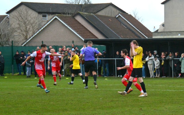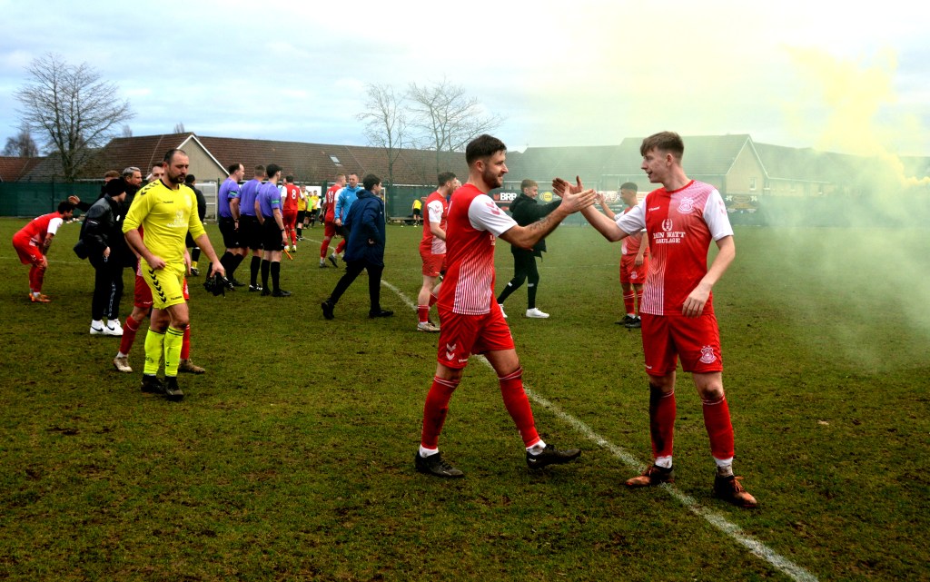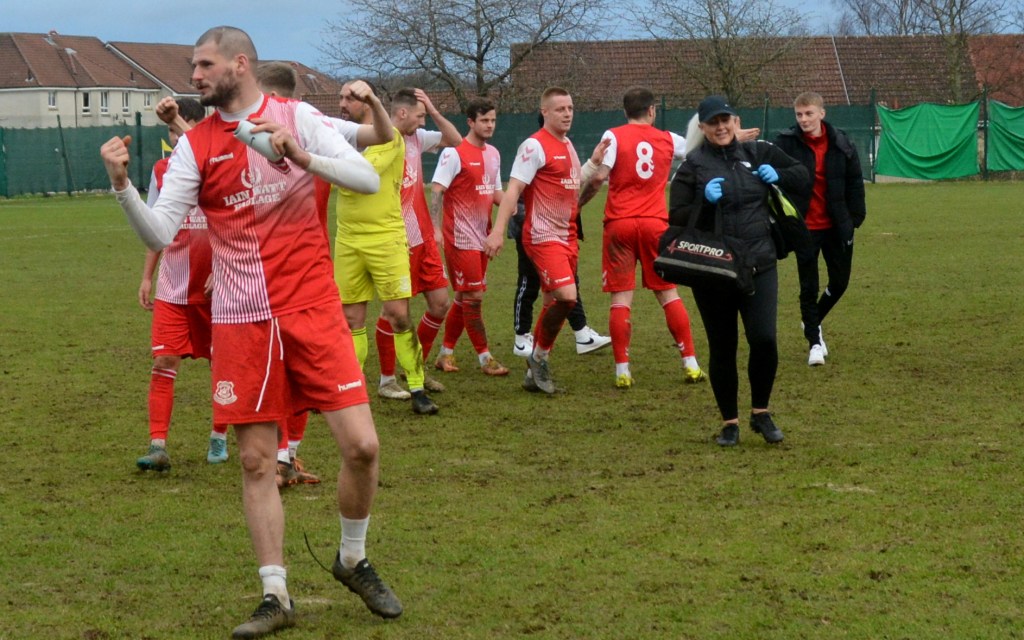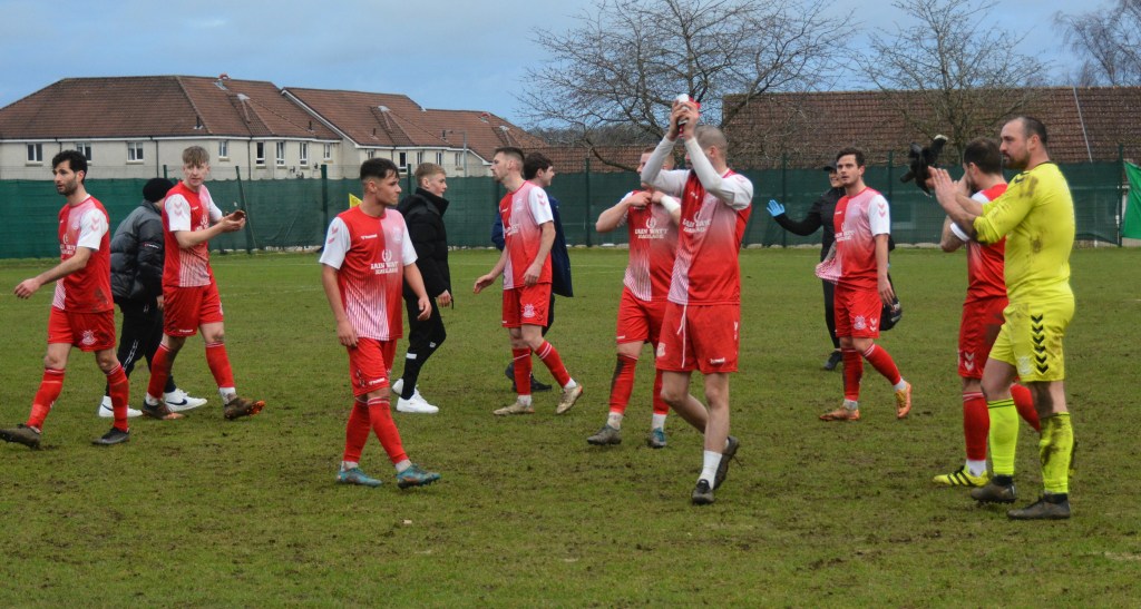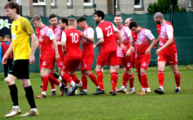 Two minutes later O’Kane picked up a pass from McKee and knocked the ball along the 18 yard line as he burst past Calvin Cowie and with Wilson on his heels he pushed forward before curling a rasper of a shot between Wilson and Craig high into the net beyond the reach of the keeper. Glens 3-0 up on 71 minutes. The celebration that followed and the outpouring of joy as Dylan ran towards the Glens dug-out (with an entourage of team-mates in pursuit) to leap into the arms of coach Alan Kerr was a very special moment in the club’s Scottish Junior Cup escapades.