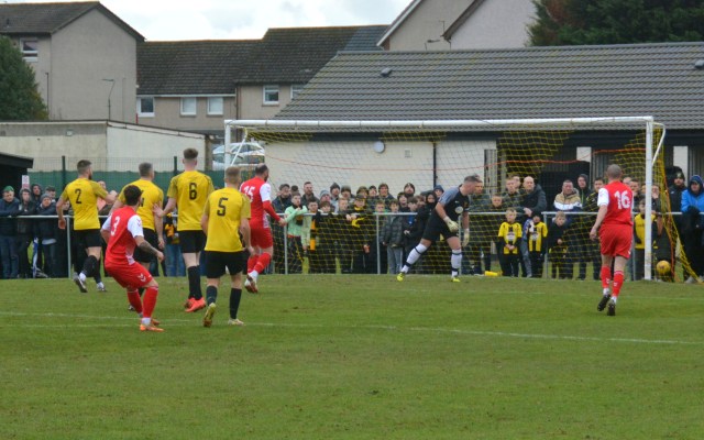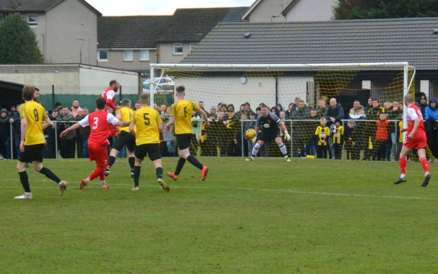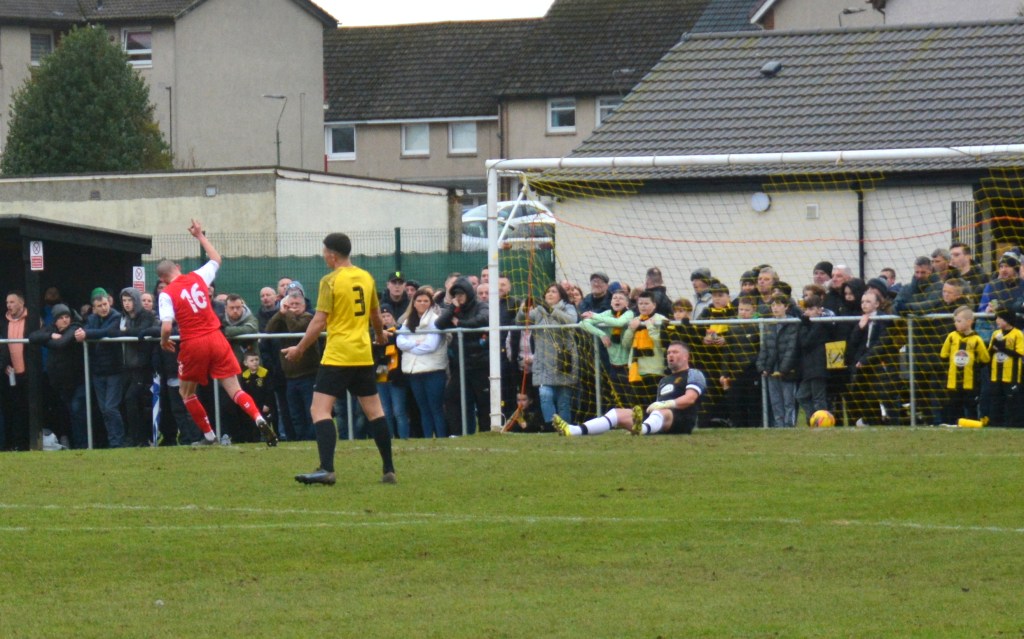 Bellshill now with a mountain to climb responded with a triple substitution and to their credit continued to create chances. Markey had to dive at his near to post to stop a low angled shot from inside the box. Soon after Caig curled a free kick from 28 yards over the Glens’ wall but again Markey gathered cleanly as his name-sake Kieron Markey looked to prosper from any spillages.