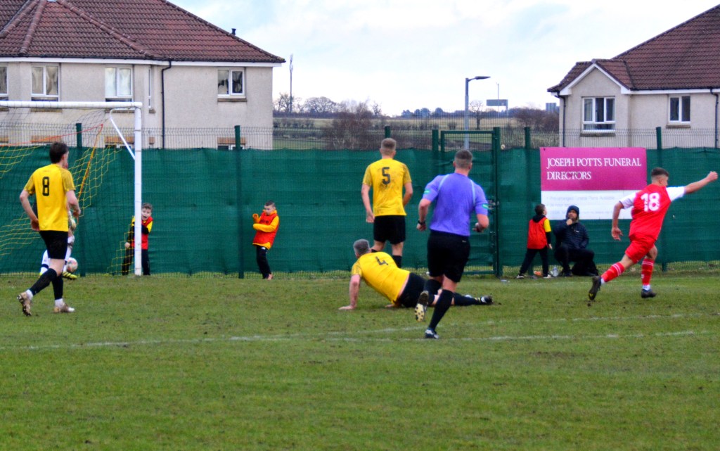 On 9 minutes Glenafton doubled their lead. Paul Paton from the half-way line slipped the ball up the left wing for Moffat to gather and hold off a defender before rolling the ball into the path of Sam McKee who struck it first time ,whizzing along the ground, past 3 or 4 defenders and beating the wrong-footed keeper at the near post.