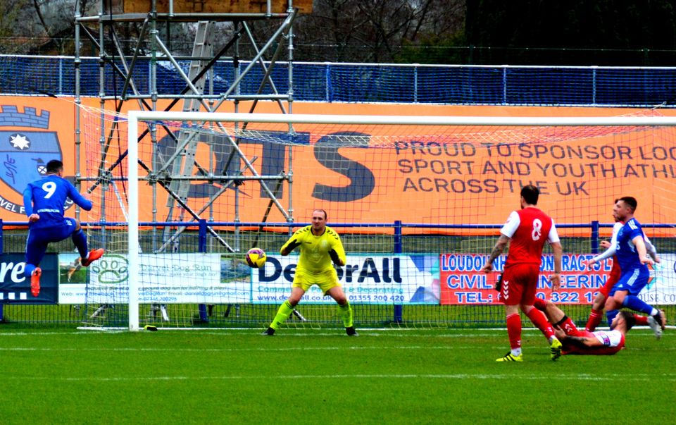 Play went back on forth on a rain-soaked Recreation Park before Darvel enjoyed a sustained spell of pressure. On 8 minutes Jordan Kirkpatrick, wide on the right, clipped a cross deep into the box which was headed wide by Craig Pettigrew but Ian McShane’s corner-kick came to nothing. Andrew Stirling was looking lively down the left and it was from here that he cut inside to curl a fierce shot that was deflected wide for another corner which was blocked at the near post by Hugh Kerr and the loose ball gather up by keeper David Markey.