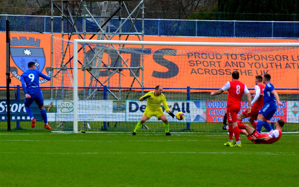 The home side continued to press and a corner-kick from the left glanced off a Glens’ head at the near post sending the ball to back post where Rowe, despite being under pressure from McDonald, managed to hook it as far as the ‘D’, where as they say the ball was recycled a number of times as Darvel shots struck the sea of shins in the box and the Glens goal remained unbreached.