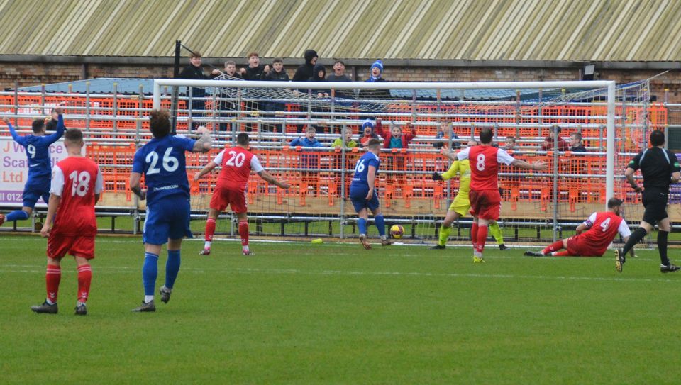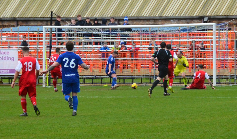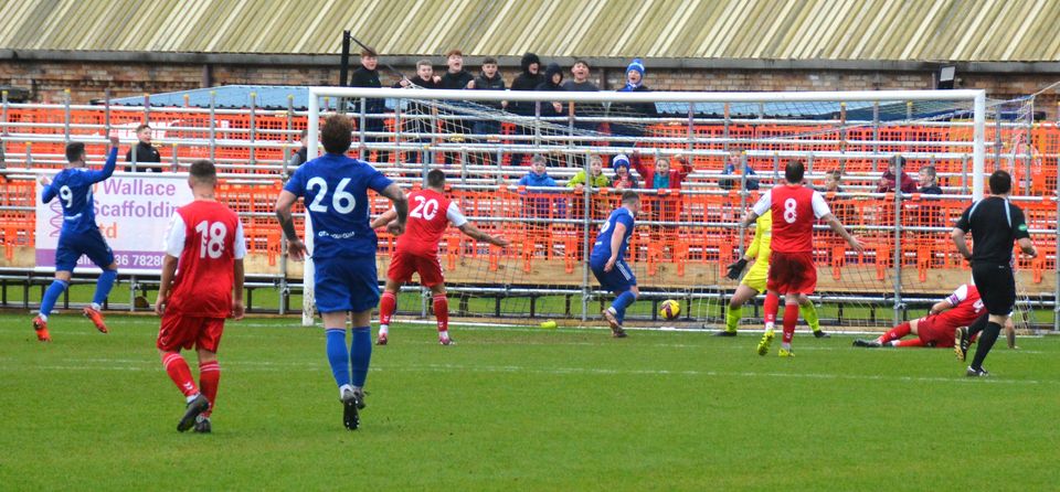 Markey launched the ball upfield where Kerr won the aerial battle with Cameron Eadie before Dylan O’Kane snapped up the loose ball to play a one-two with Kerr and progress to the left-hand side of the box. From here he clipped a ball into the goal-mouth which just went beyond Moffat, breaking between two defenders, but fell for Adam Caldwell on the far side of the box, to play it back to Sam McKee. The pair then played a couple of one-two’s, however with defenders in close proximity McKee was forced to retreat out of the penalty area and curl a ball into the heart of the goal where Hugh Kerr leapt to guide a header past keeper Chris Truesdale rooted on his line.