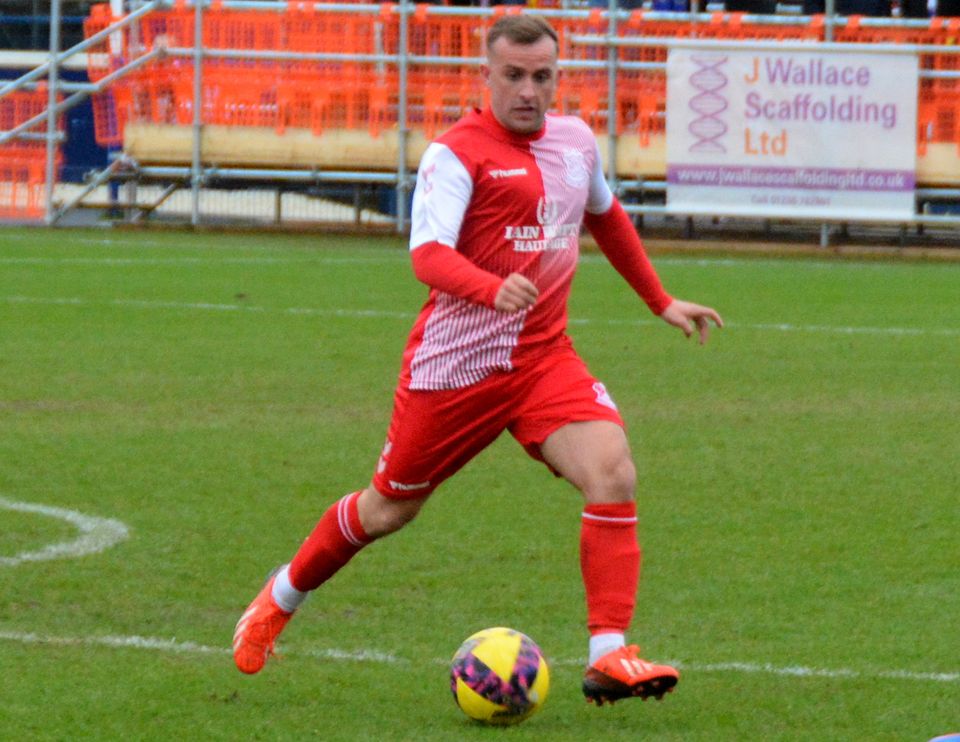 Play went back on forth on a rain-soaked Recreation Park before Darvel enjoyed a sustained spell of pressure. On 8 minutes Jordan Kirkpatrick, wide on the right, clipped a cross deep into the box which was headed wide by Craig Pettigrew but Ian McShane’s corner-kick came to nothing. Andrew Stirling was looking lively down the left and it was from here that he cut inside to curl a fierce shot that was deflected wide for another corner which was blocked at the near post by Hugh Kerr and the loose ball gather up by keeper David Markey.
