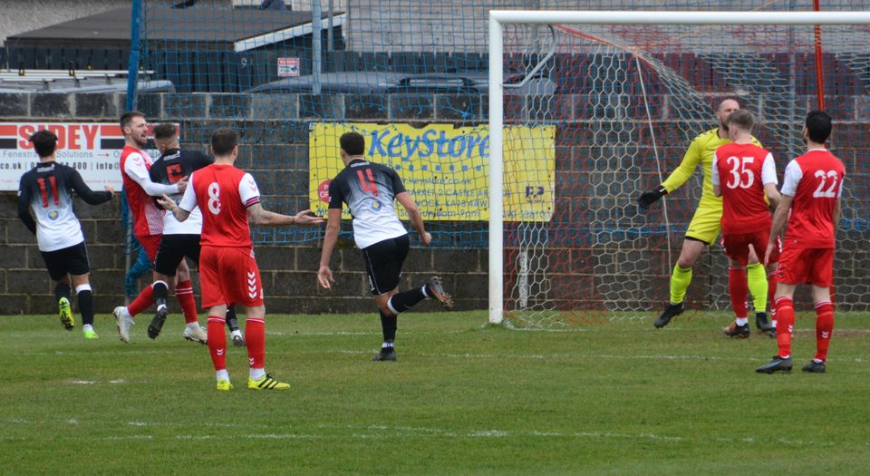 Two minutes later Rossiter’s corner kick was met by Scot Rough on the six yard line and although his glancing header was heading wide of the back post the crouching Declan Hughes tried to divert it goalward only for the ball to loop high over the bar.
