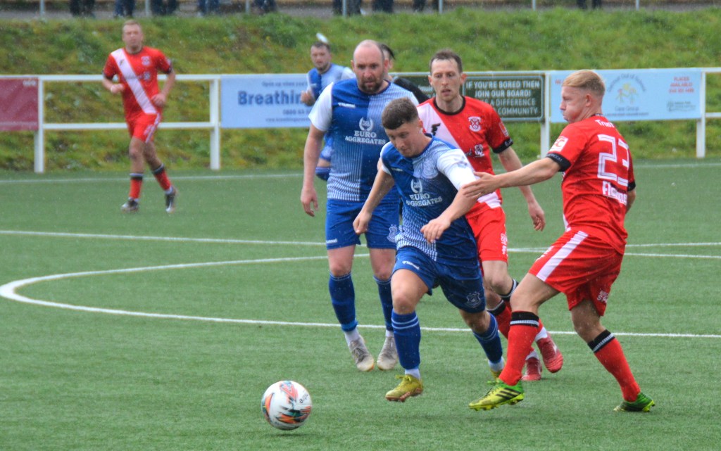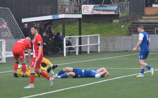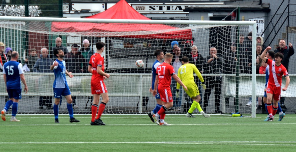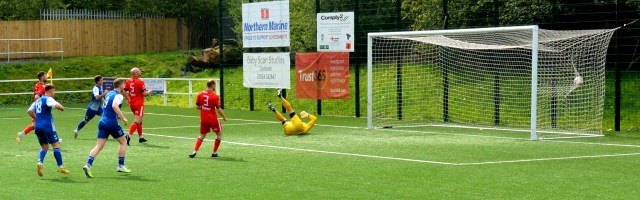 However, on 73 minutes Bankies added a fifth as Glens got into a fankle! Donnelly launched a goal kick high upfield and as McMullin prepared to head it clear it caught him square on his crown sending the ball high into the air and Glens’ defender crumbling to ground in some distress. In the meantime, McLernan leapt high to head the ball into the box where both McWaters and Little gave chase while Burns rushed from his line and it was Nicky Little that got a touch to edge it wide of the keeper before side footing the ball into the empty net.