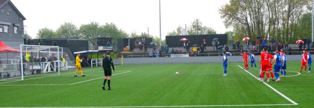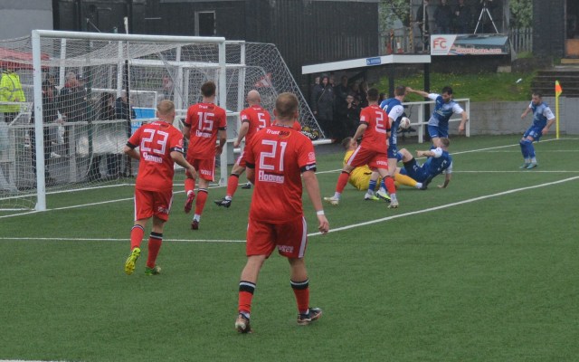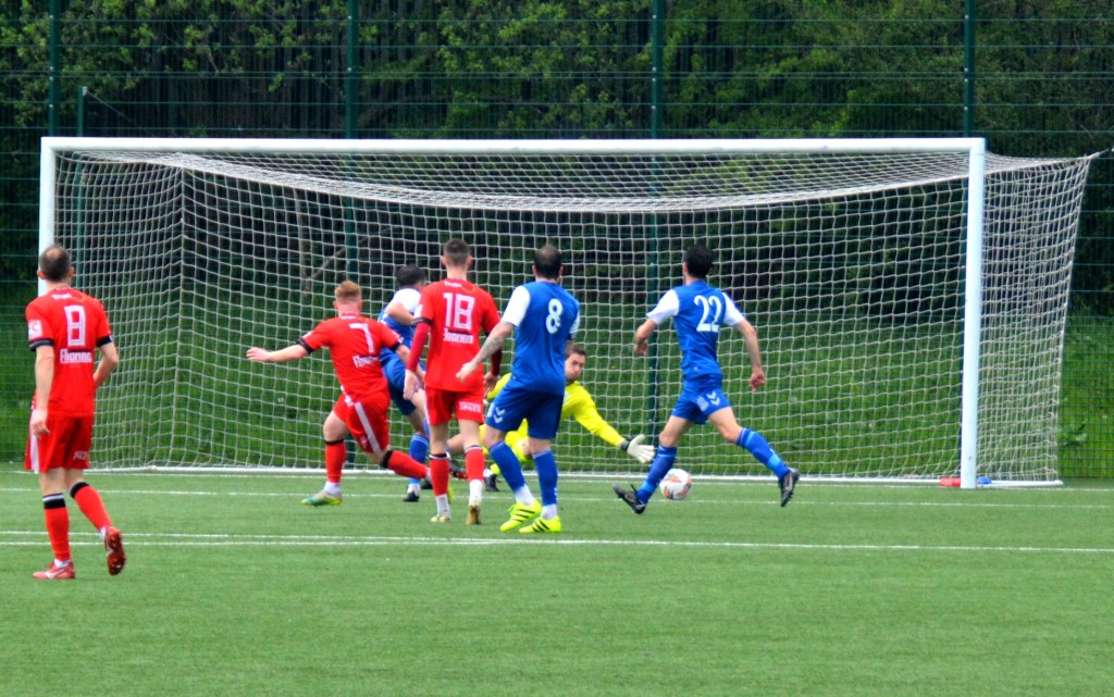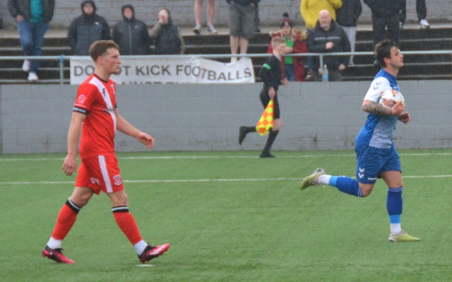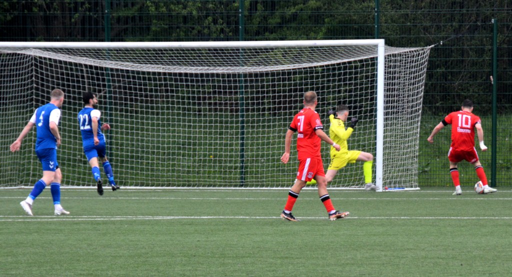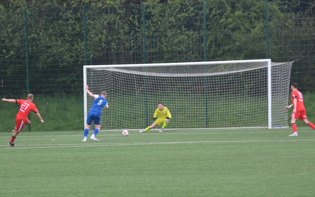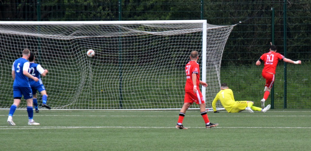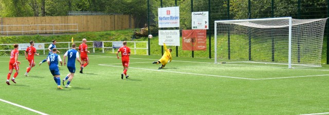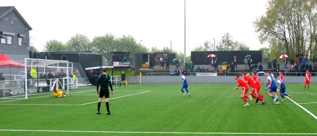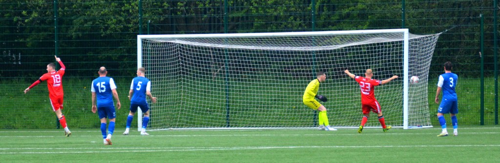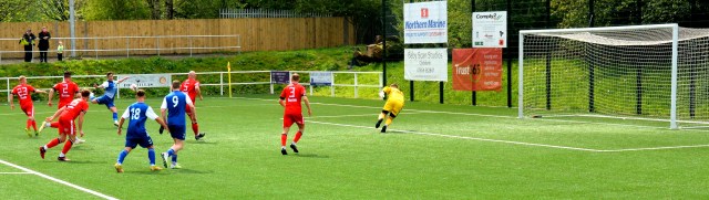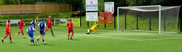 The Glens fought their way back into the game. After a determined run down the right by Ryan Nisbet he whipped the ball into the six-yard for Michael Moffat only for Jamie Darroch to intercept and head out for a corner. It was Darroch that headed the corner-kick clear out the box only for O’Kane to recover the ball and hold of Kelly to break down the left and clip a great ball high into the six-yard box for the inrushing Hugh Kerr and McMullin. However, the former was being held back by Hodge and it was the latter that leapt high to challenge for the ball with the outrushing keeper, both colliding and collapsing to the ground. The referee pointed to the spot only for the assistant referee to raise his flag, apparently suggesting the keeper had been fouled. However after a lengthy discussion the referee’s decision stood. and Scott McLean kept his cool to slot home the spot-kick an halve the deficit on 32 minutes.