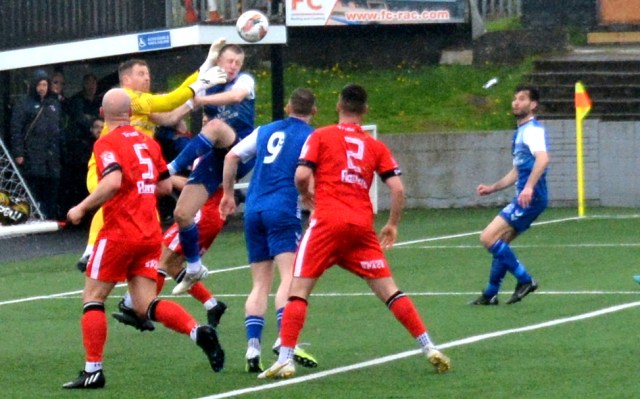Play went back and forth and Glens had a couple of half chances from scuccessive corner-kicks that saw the Donnelly clutch Rowe’s header and then watch Kerr’s header dip over the bar.