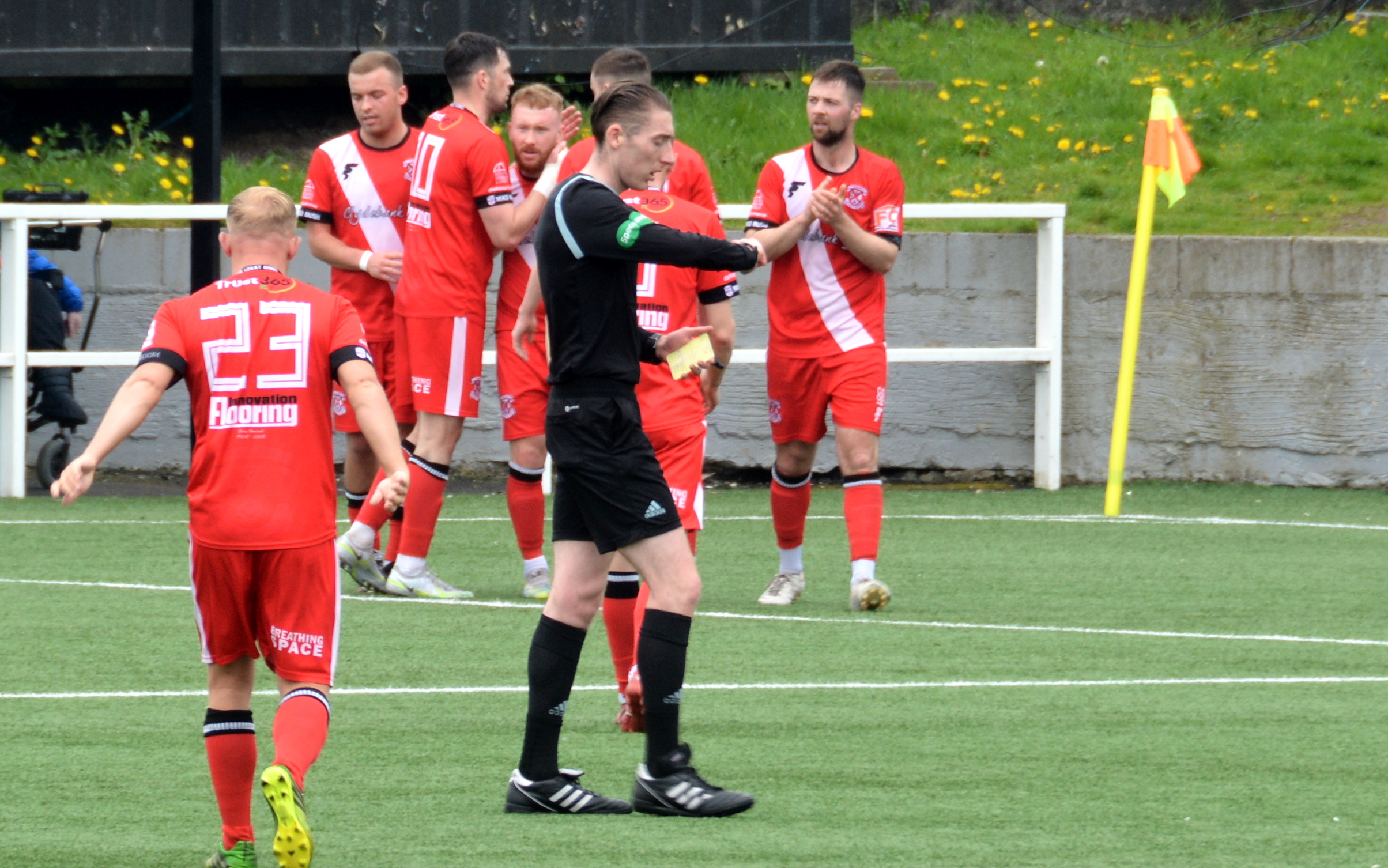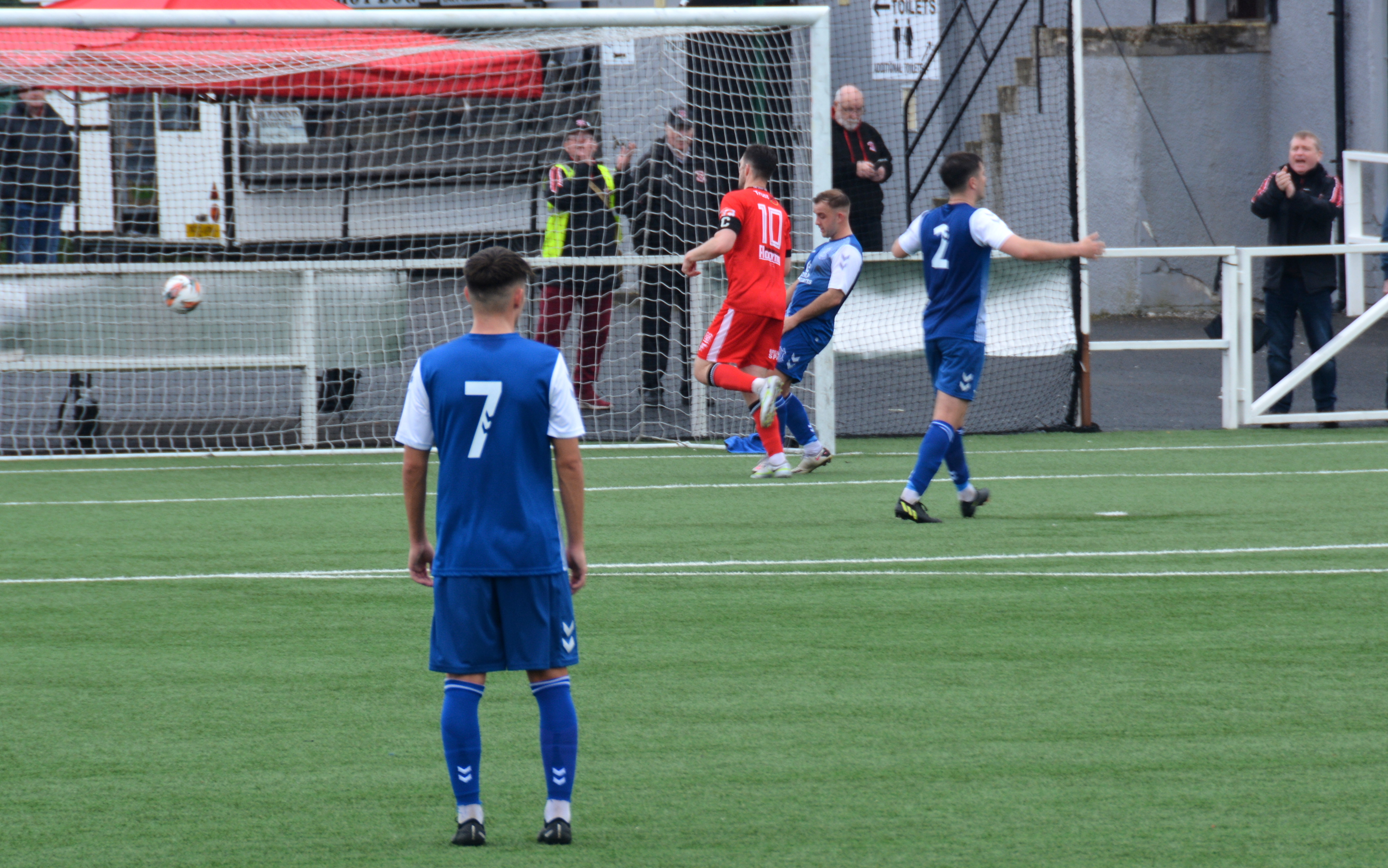 The Glens fought their way back into the game. After a determined run down the right by Ryan Nisbet he whipped the ball into the six-yard for Michael Moffat only for Jamie Darroch to intercept and head out for a corner. It was Darroch that headed the corner-kick clear out the box only for O’Kane to recover the ball and hold of Kelly to break down the left and clip a great ball high into the six-yard box for the inrushing Hugh Kerr and McMullin. However, the former was being held back by Hodge and it was the latter that leapt high to challenge for the ball with the outrushing keeper, both colliding and collapsing to the ground. The referee pointed to the spot only for the assistant referee to raise his flag, apparently suggesting the keeper had been fouled. However after a lengthy discussion the referee’s decision stood. and Scott McLean kept his cool to slot home the spot-kick an halve the deficit on 32 minutes.