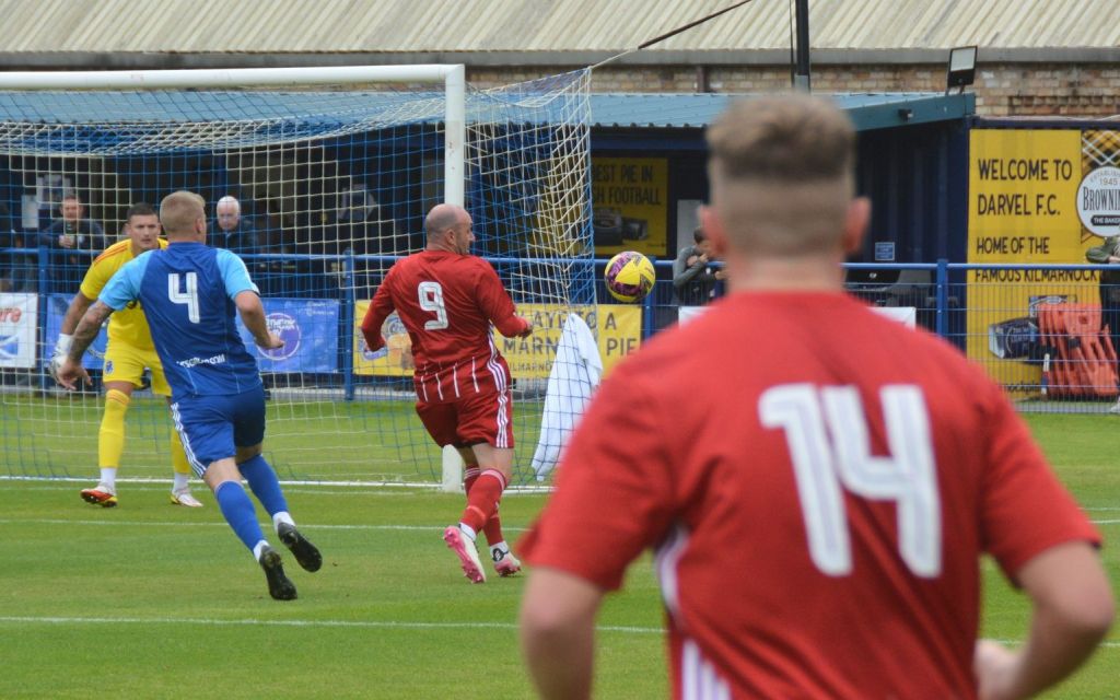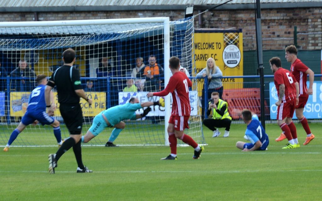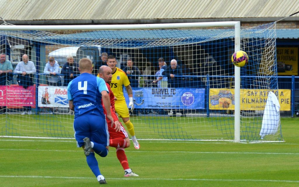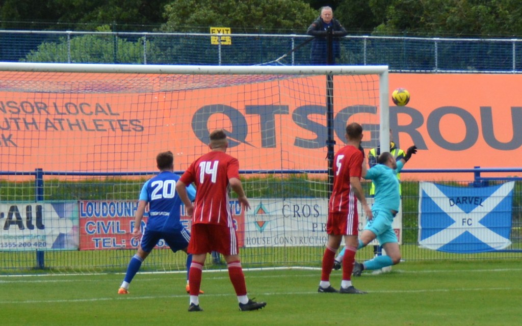 Darvel then enjoyed a good spell of pressure albeit with lots of passing on the outskirts of the box but couldn’t breach the penalty area until a Sideserf cross from wide on the left bounced of the top off the bar and fell for Glasgow to bullet a diving header that was blocked by Markey before he pounced on the loose ball.