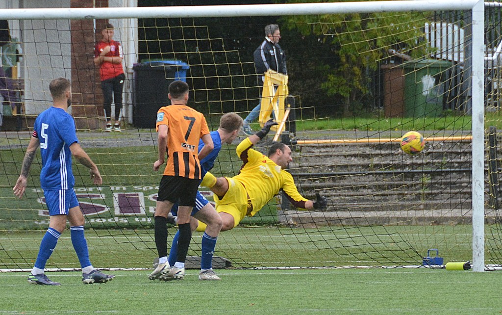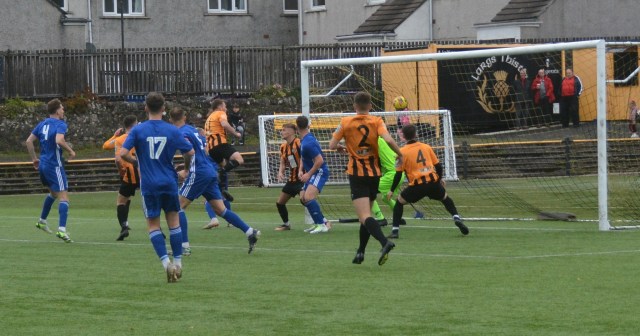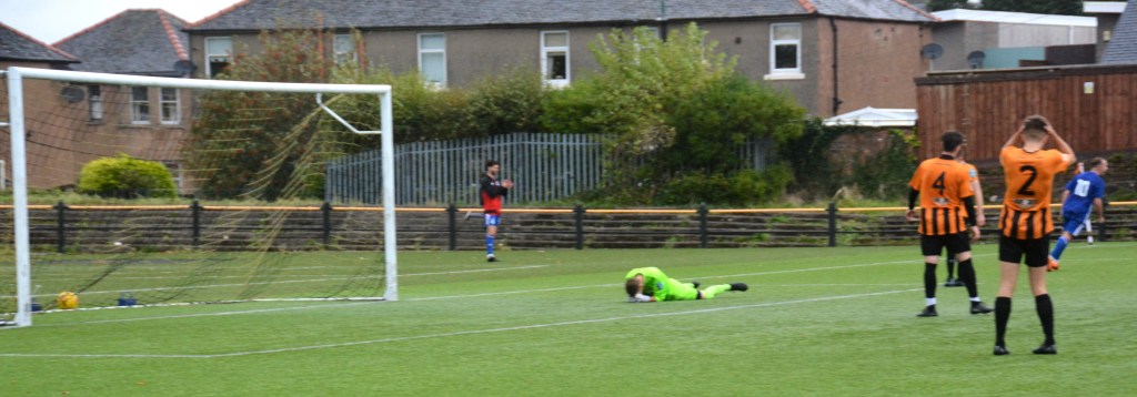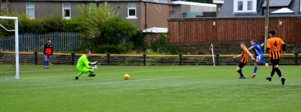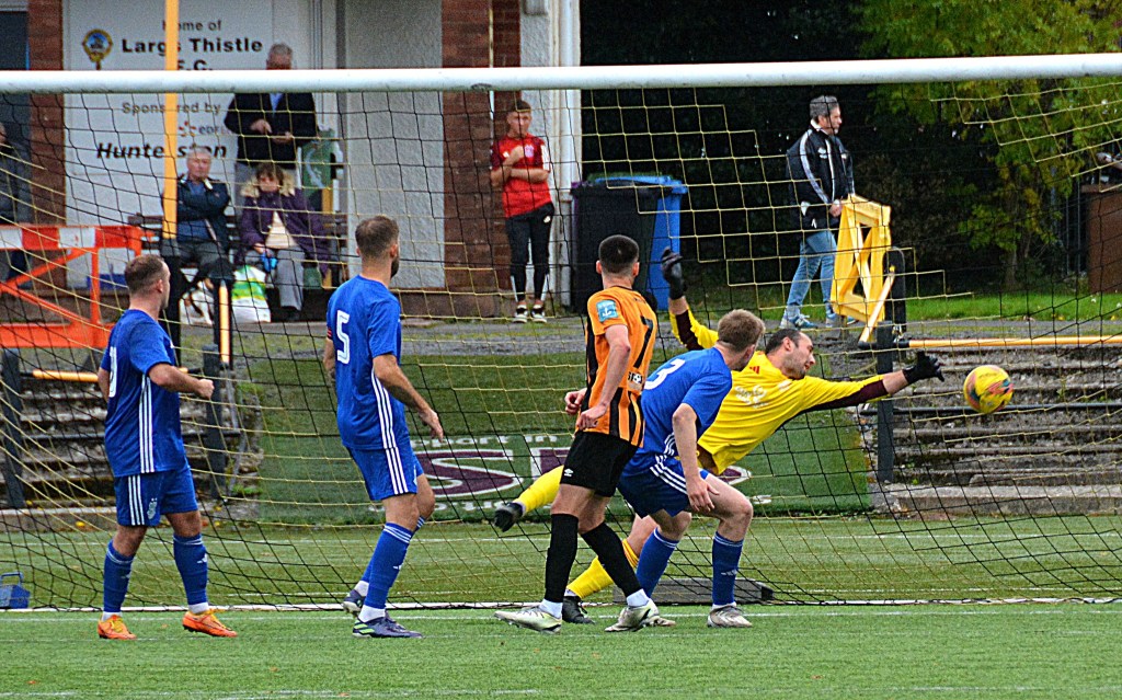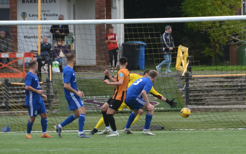 On 6 minutes Moffat picked the ball up just inside the Largs half and burst through the middle undeterred until Forbes closed in at the edge of the box forcing the striker to blast a shot that dipped inches over the bar with keeper Matt Johnston rooted to his line.