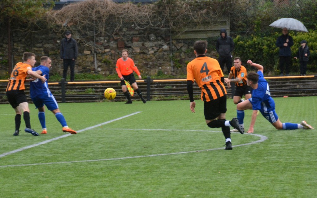 Sinnamon and McWaters combined well down the right as did Frizzell and Moffat through the middle without however testing the keeper. At the other end Will Sewell from the left-hand corner of the box curled a shot that just dipped of the bar although keeper David Markey had it covered.