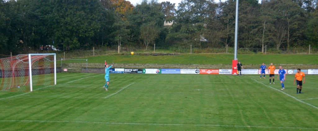 Soon after Sinnamon on the right floated a high ball to the back post for the inrushing McKee but the keeper was taking no chances and tipped it wide for another corner. McLean clipped a carbon copy of the previous corner and again the keeper came off his line but could only flap the ball away on this occasion past his back post for Glens’ third corner which was comfortably clear.