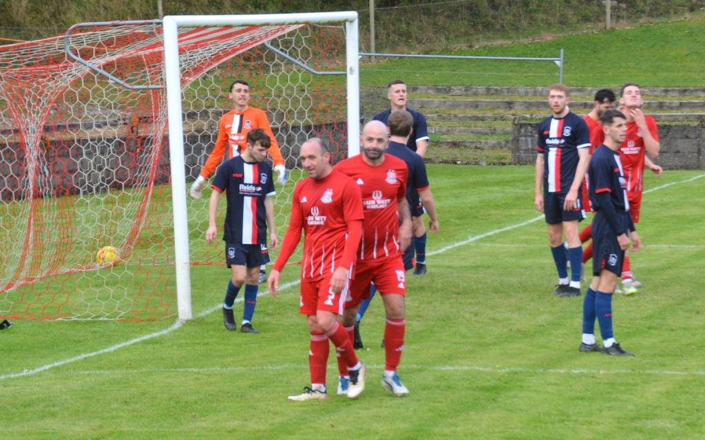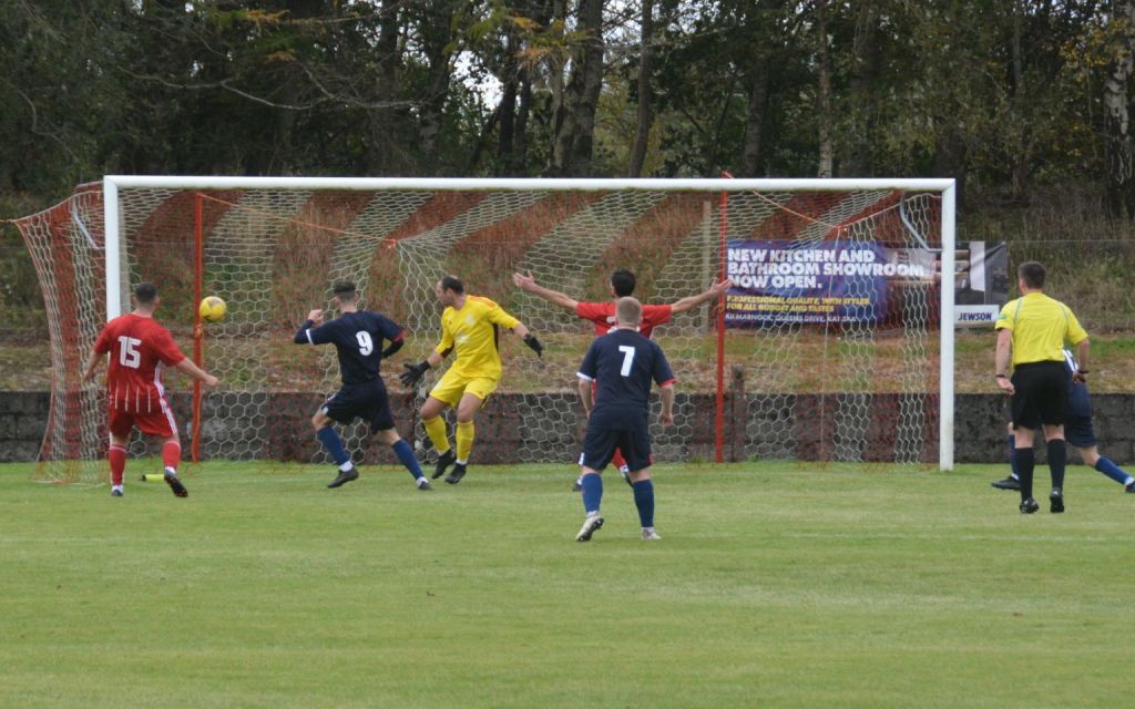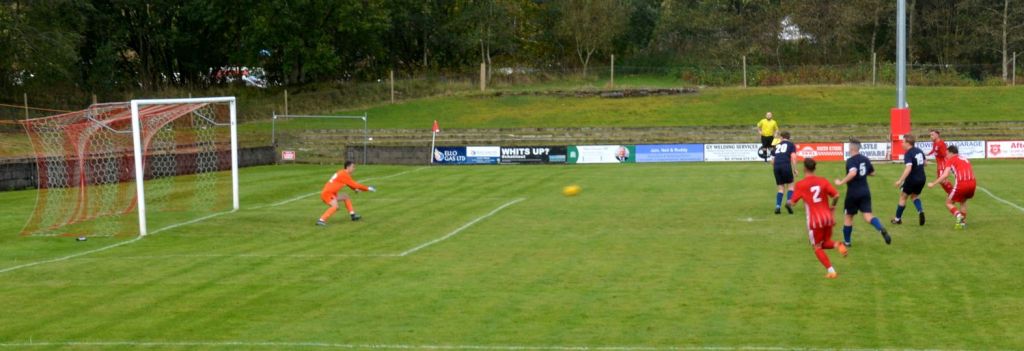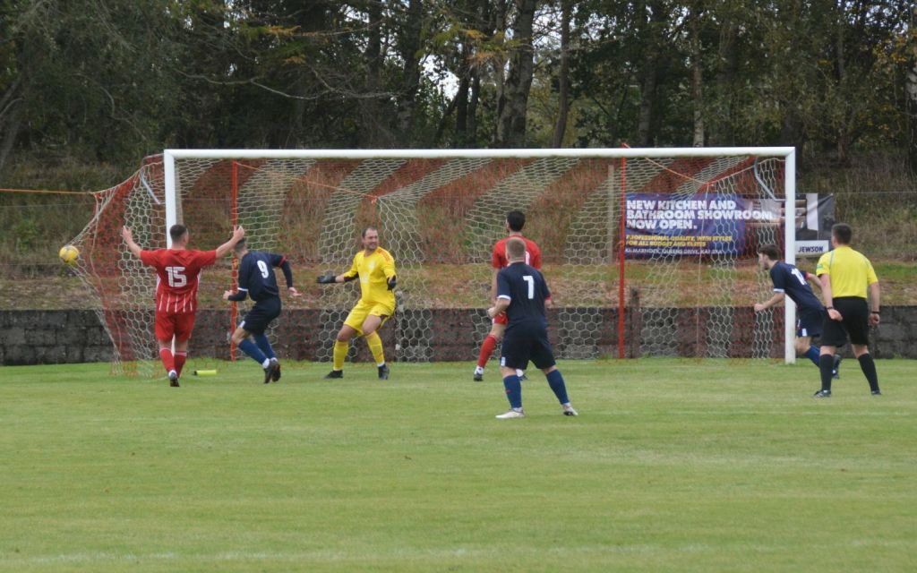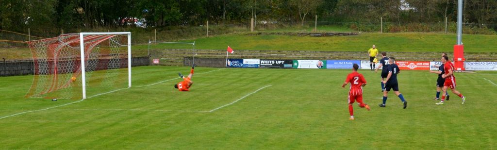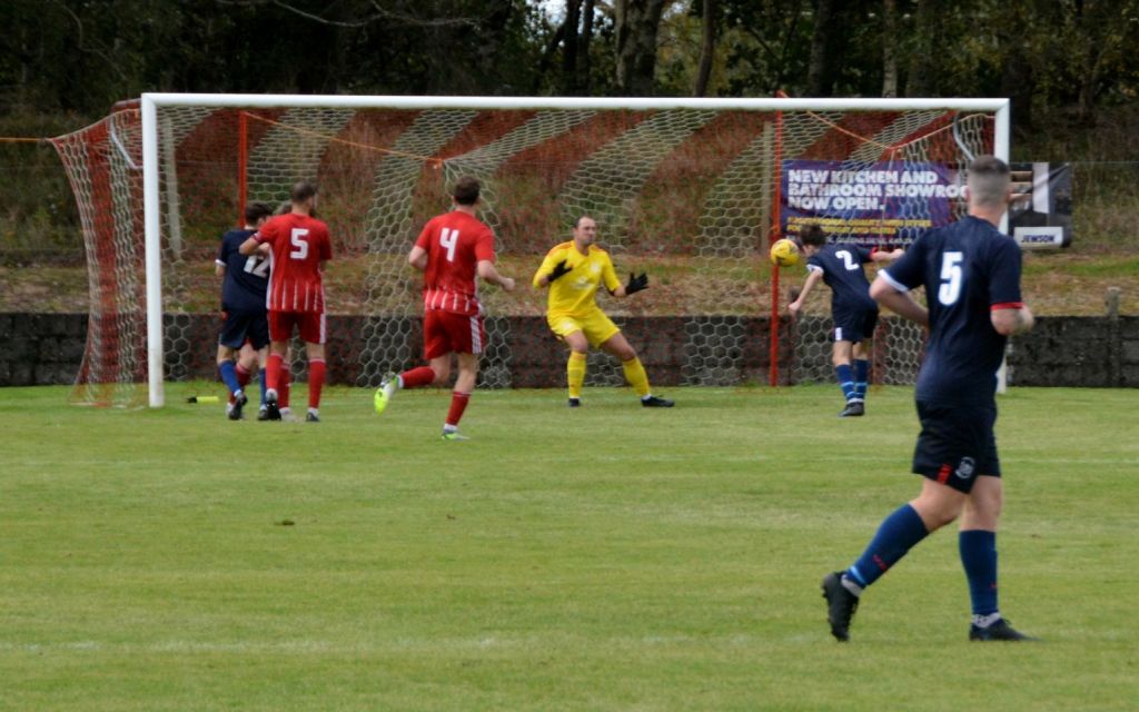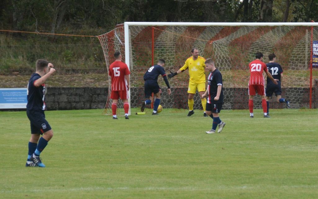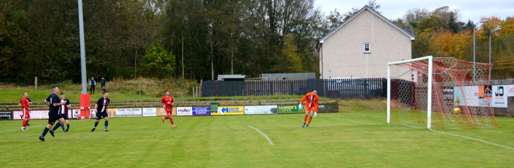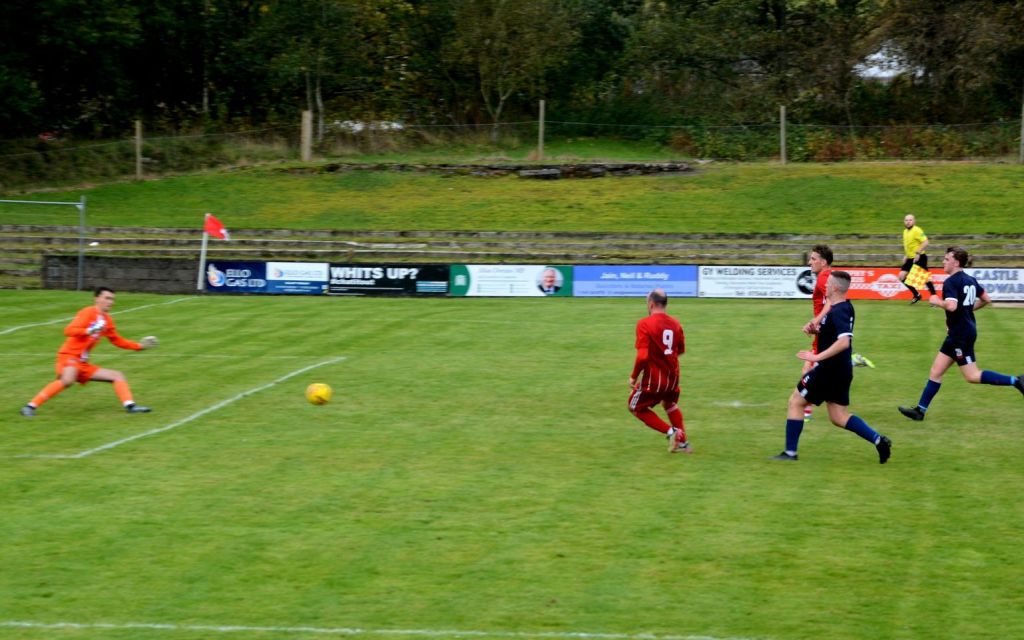 Nevertheless, the home side continued to press and broke the deadlock on 21 minutes. Keeper Derrin Fairns strolled off his line with the ball and passed it to Cameron Fairns at the corner of the box, however he took a bad touch and the alert McLean burst forward to steal the ball and slip it to Michael Moffat to take a good touch on the 18 yard line before casually guiding a well struck shot into the far corner of the net, beyond the back-tracking goalie.