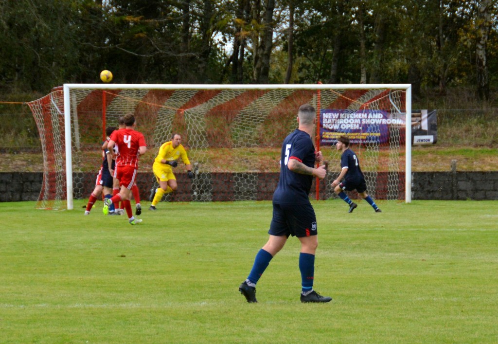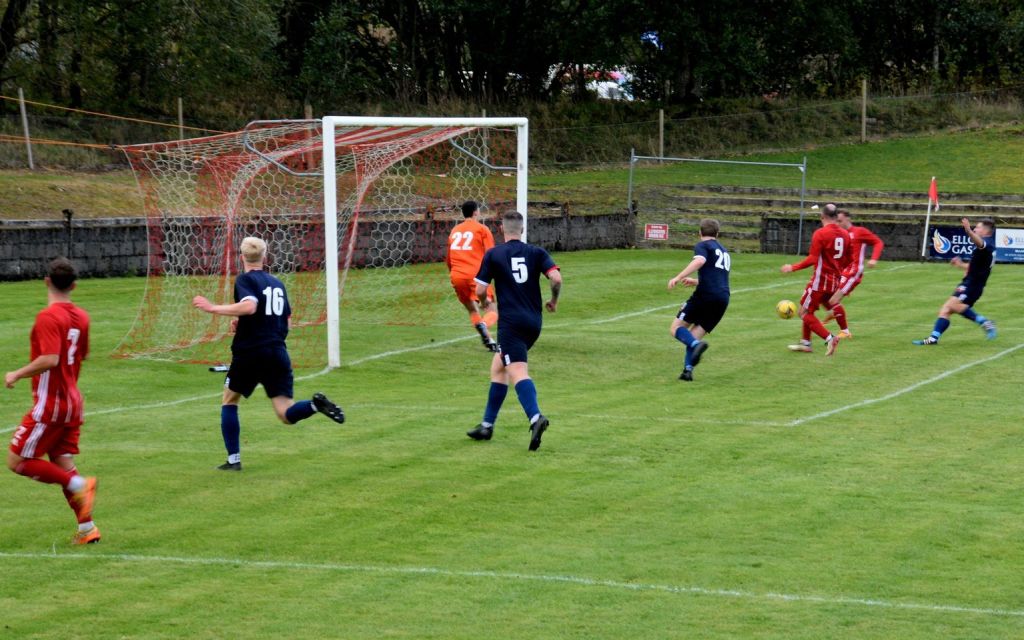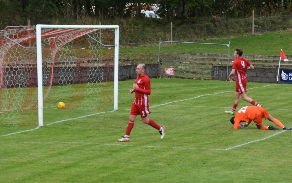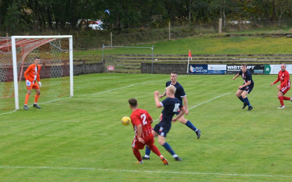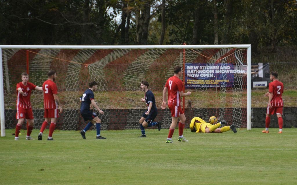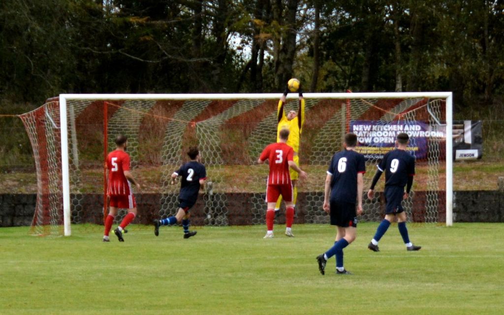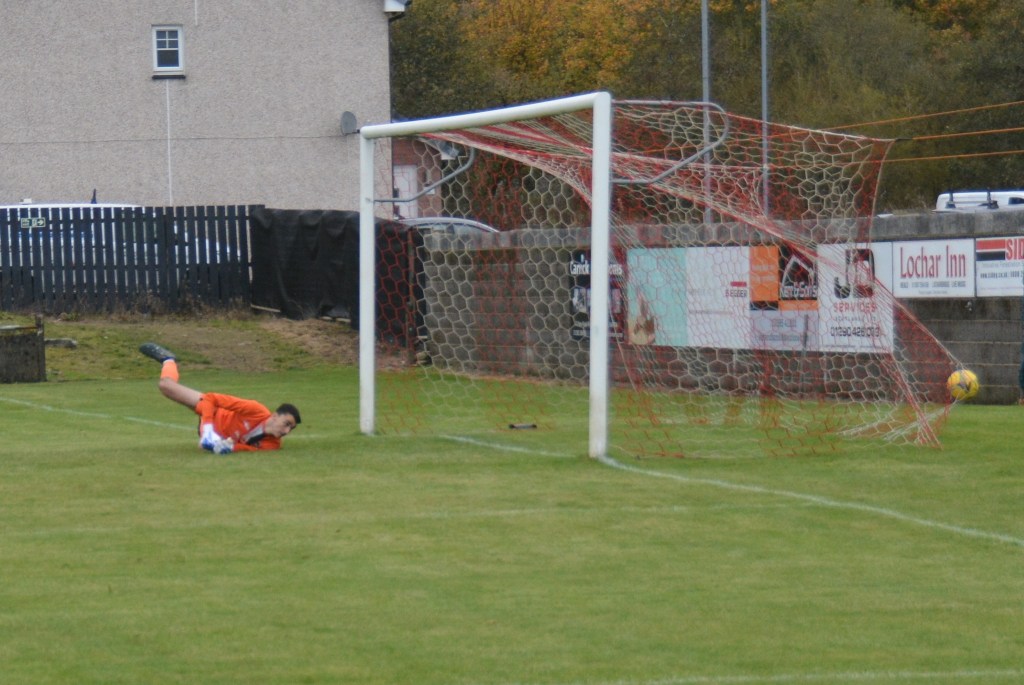Nevertheless, the home side continued to press and broke the deadlock on 21 minutes. Keeper Derrin Fairns strolled off his line with the ball and passed it to Cameron Fairns at the corner of the box, however he took a bad touch and the alert McLean burst forward to steal the ball and slip it to Michael Moffat to take a good touch on the 18 yard line before casually guiding a well struck shot into the far corner of the net, beyond the back-tracking goalie.
