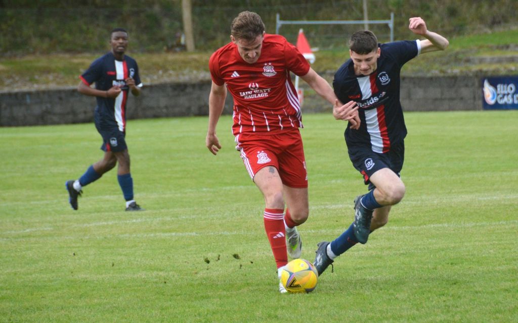 No doubt words were said at the break about surrendering a two-goal lead in a five-minute spell and within two minutes of the start the Glens regained their lead. They won a free kick some 25 yards from goal outside the right-hand side of the box. McMullin, Fraser and McLean congregated around the ball and it was the latter Scott McLean that stabbed a super free-kick over the jumping wall and through the space between keeper’s finger tips and the underside of the bar. A glorious goal, Glens 3-2 on 47 minutes.