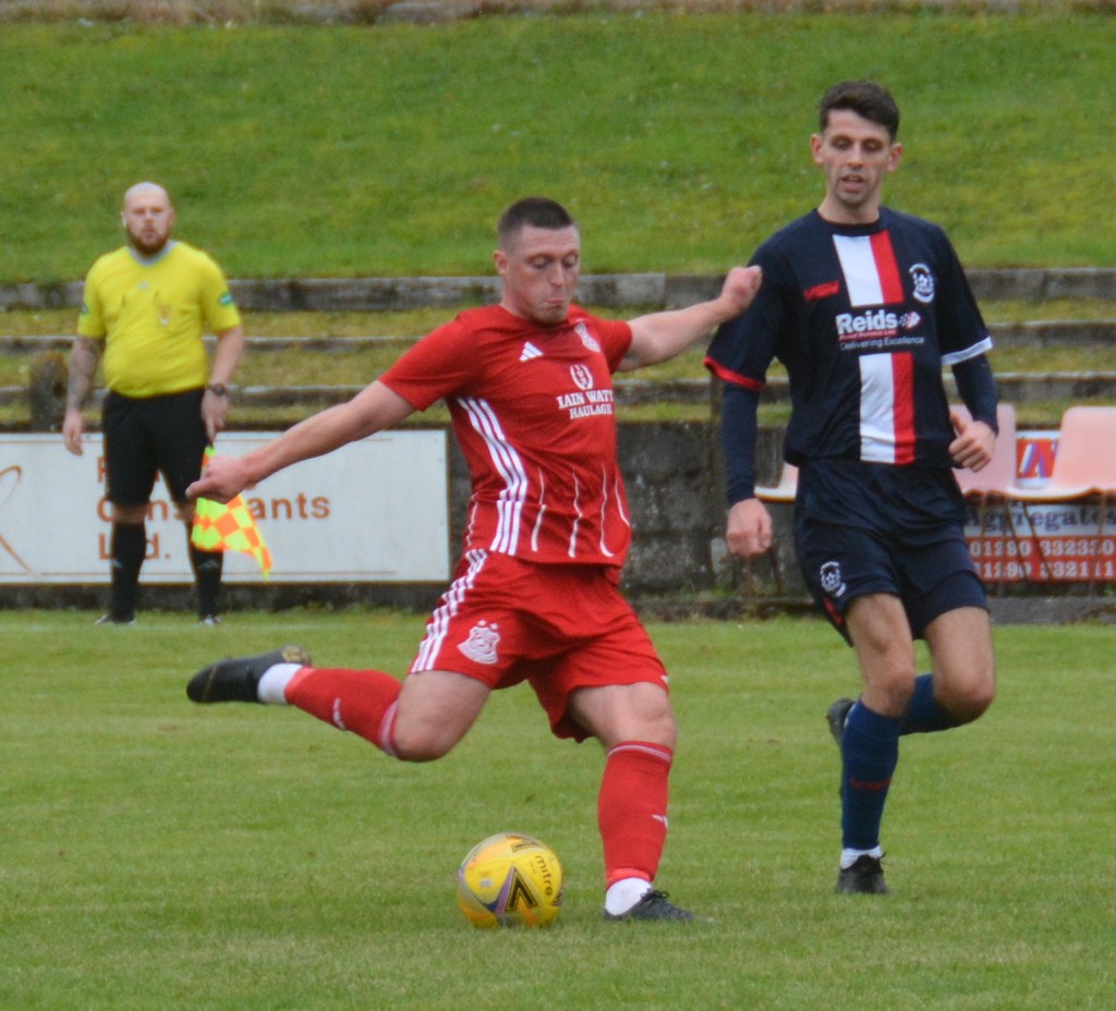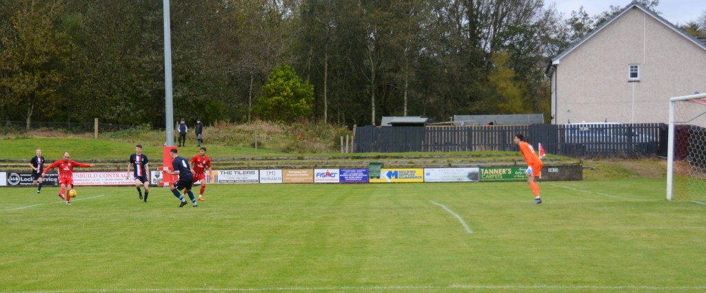 The home side then piled on the pressure with a wave of attacks. McBeth drove forward and rolled the ball into the box for Moffat to chase and drill a low angled shot that was blocked by Tony Etherson and the incoming McBeth pounced on the loose ball only for the keeper’s outstretched leg to block his shot before Paton then fired the rebound over the bar. Soon after Paton chipped a ball into the box were McLean with his back to goal killed it on his chest before swivelling to fire a volley from 12 yards that beat the keeper but whizzed wide of the post.