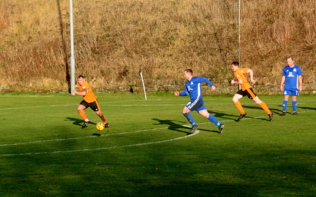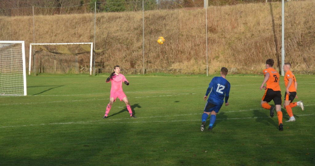 It was all Glens now with waves of attack that were repelled by the Vics as they defended in numbers. Luke McBeth from tight on the right flank clipped the ball inside to Moffat at the edge of the ball who rolled it back for McMullin to leather the ball from a good 30 yards sending it flying over the bar. Keeper Wilson launched the goal kick to the half-way line where McBeth sent a header high back up the park for Michael Moffat to get the jump on three defenders, with Agnew playing him onside despite the raised arms, and control the ball before breaking into the left-hand side, and cut inside the back-tracking Fraser MacDuff before curling a low shot from 10 yards under the keeper’s body and into the net – Glens 1-0 up on 18 minutes.