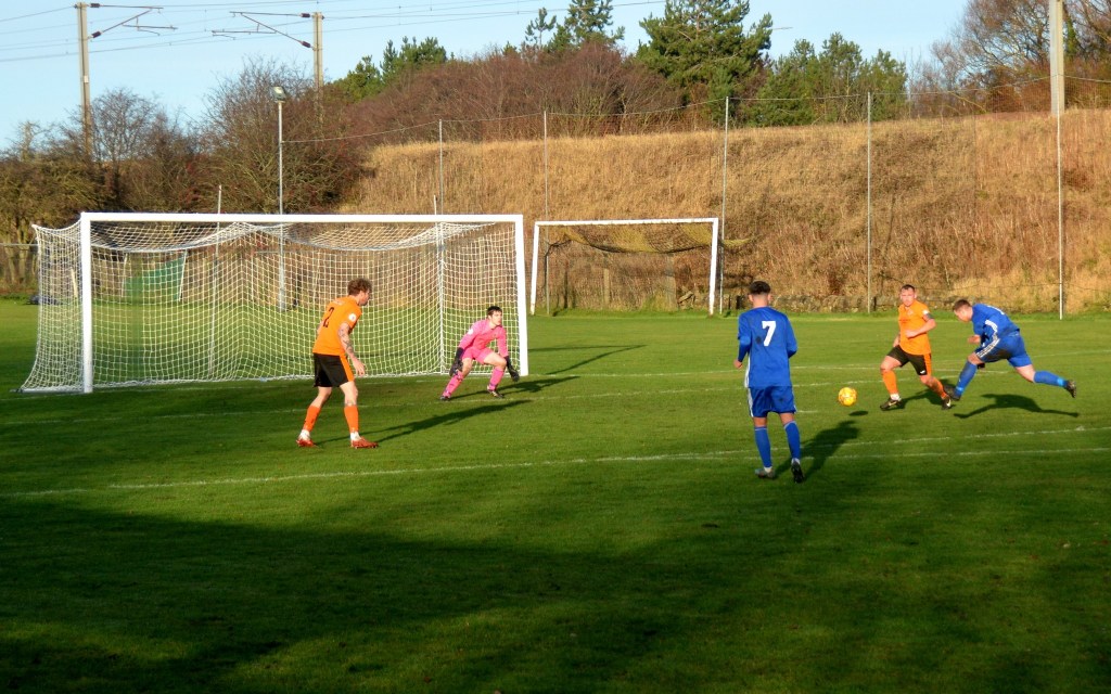 Midway through the half Markey rolled the ball out to Rowe on the right who launched it upfield for Moffat to chase down the right, with MacDuff on his heels, before breaking into the box to drill a low diagonal shot from 10 yards and although the advancing Wilson got a foot to it, the ball continued to trundle towards the empty net only for the chasing MacDuff to clear it on the line.