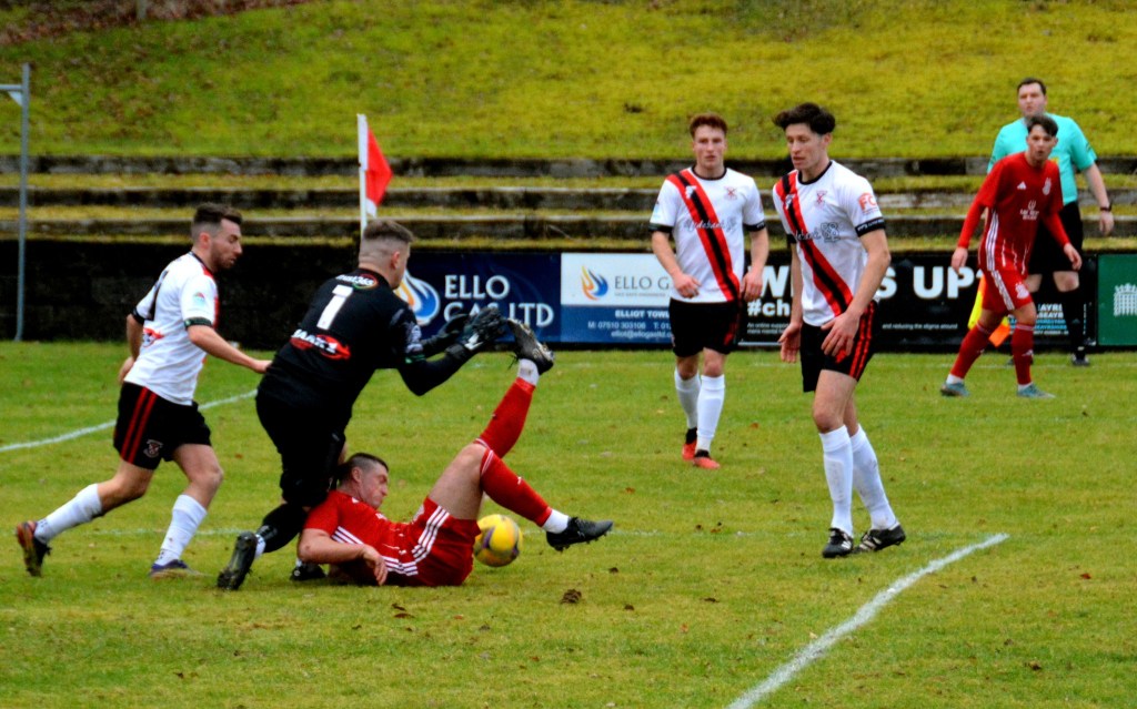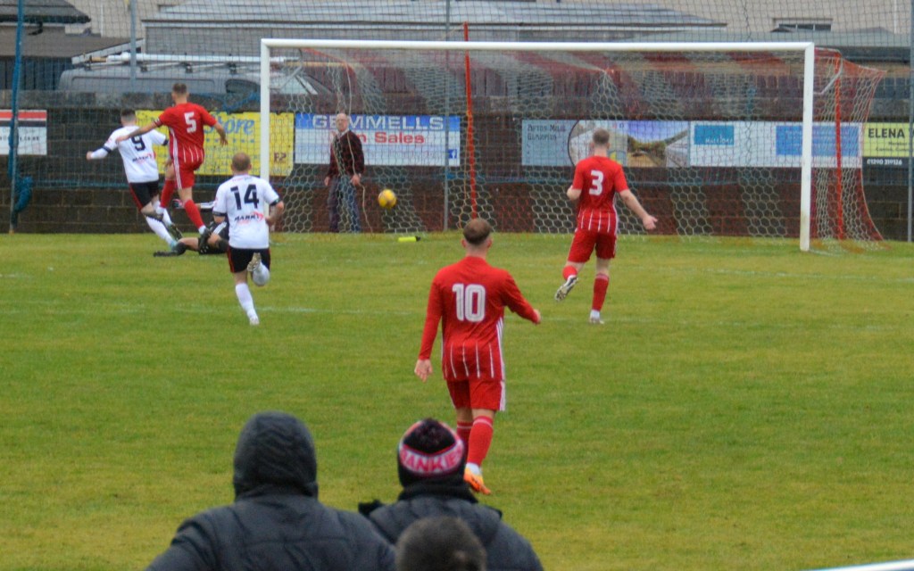 Although Glens kicked off on a dull and breezy day it was Bankies that blasted out the blocks with Callum Graham driving deep into Glens’ box forcing keeper David Markey to dive at his feet. Soon after the two met again as Graham broke into the left-hand side of box only for outrushing Markey to get a touch off the ball and deflect it wide for a corner. McGonigle floated the ball to near post where it was headed over the bar by Paul Paton and his follow up corner was headed on at the near post by