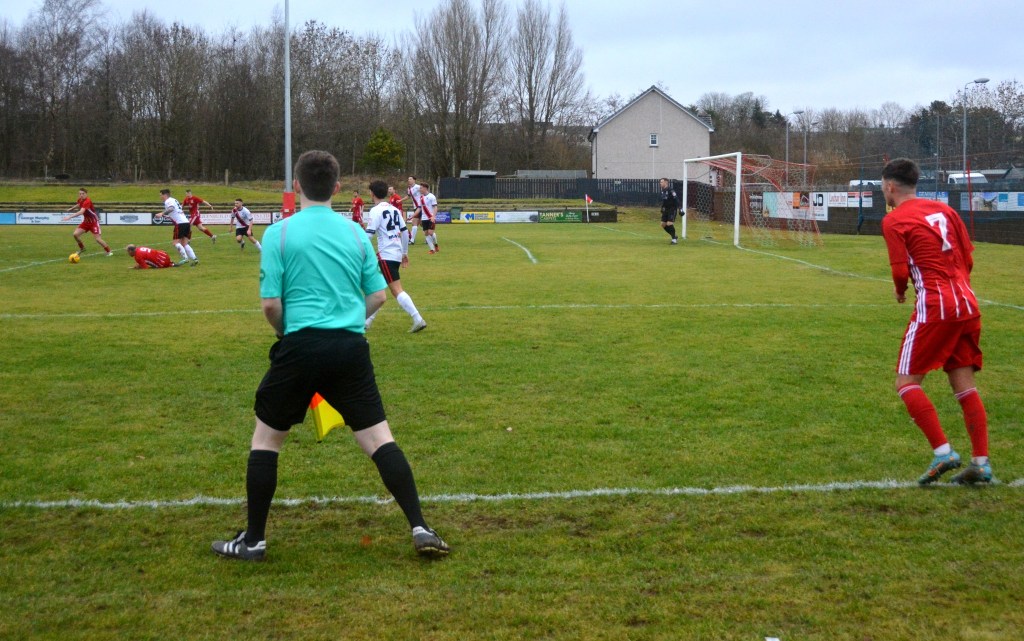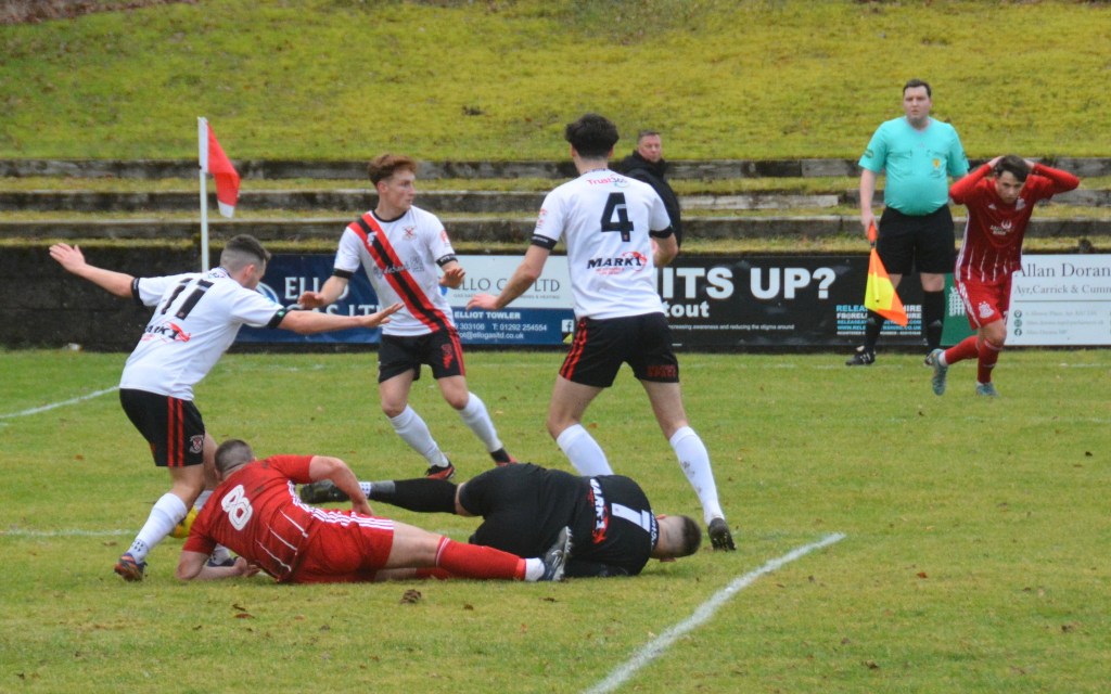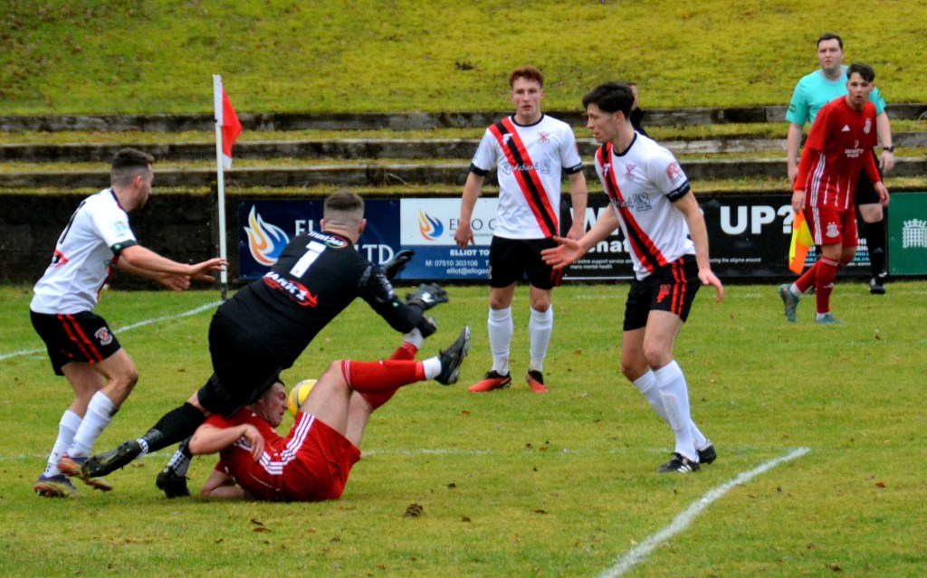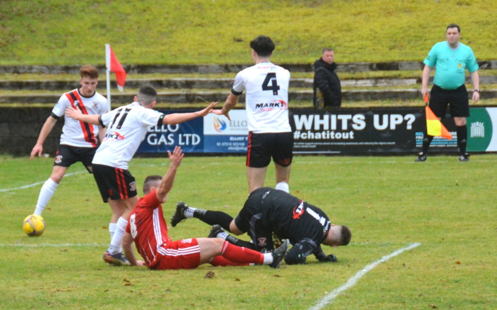 On 23 minutes Frazer Johnstone nicked the ball from Caddis just inside the Glens half and as he we went to gather it team-mate Grant intercepted only to lose control of the ball. The inrushing Lyall Holding was now favourite to win the loose ball as Grant backed out of the tackle and the Glens full back slid in to win the ball cleanly and as the Bankies man tried to block the clearance he got caught with the follow through, tumbling to the ground. Within seconds the Clydebank team were surrounding the referee baying for a red card but credit to the official he kept his head before making a decision and Holding was shown a yellow card.