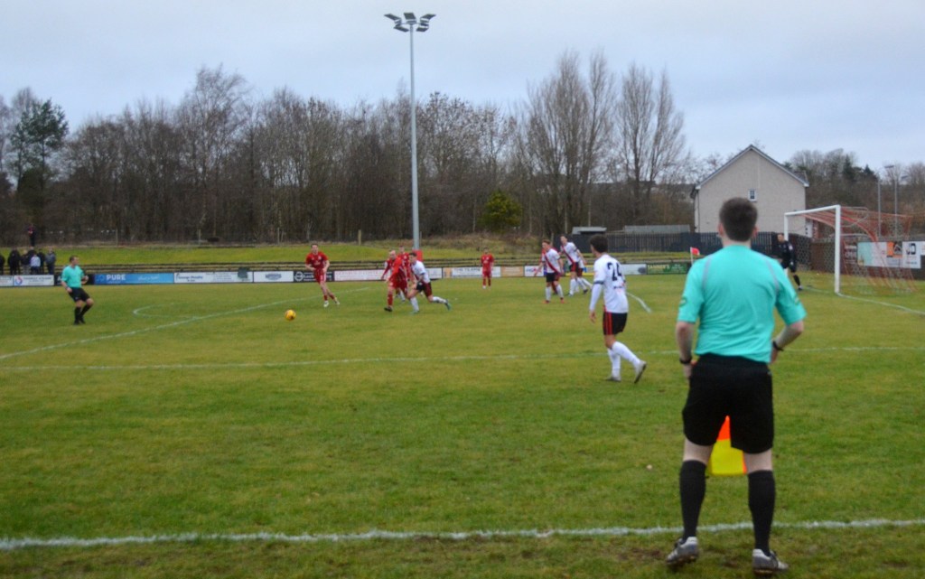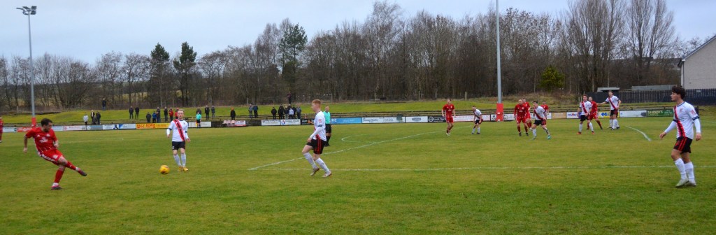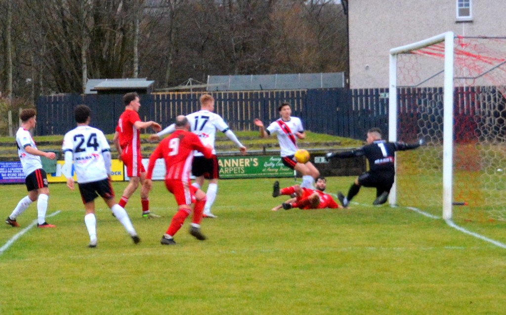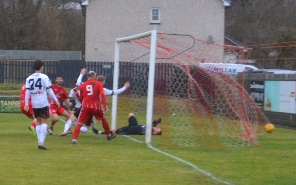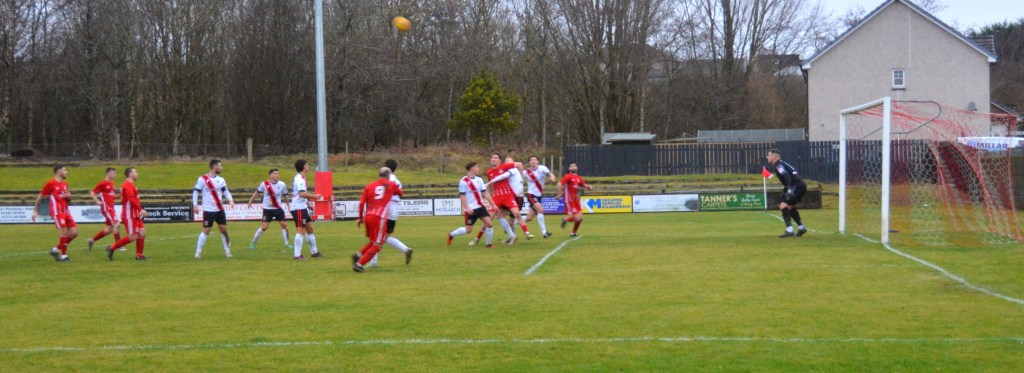 In the closing action of the half the Bankies won a free kick a few yards wide of the right-hand corner of the box. McGonigle floated it high into a crowded six -yard box where Craig Pettigrew won the aerial battle against Niven, to head the ball clear of danger … and of time, as the half-time whistle blew.