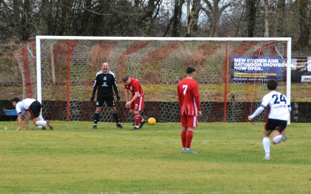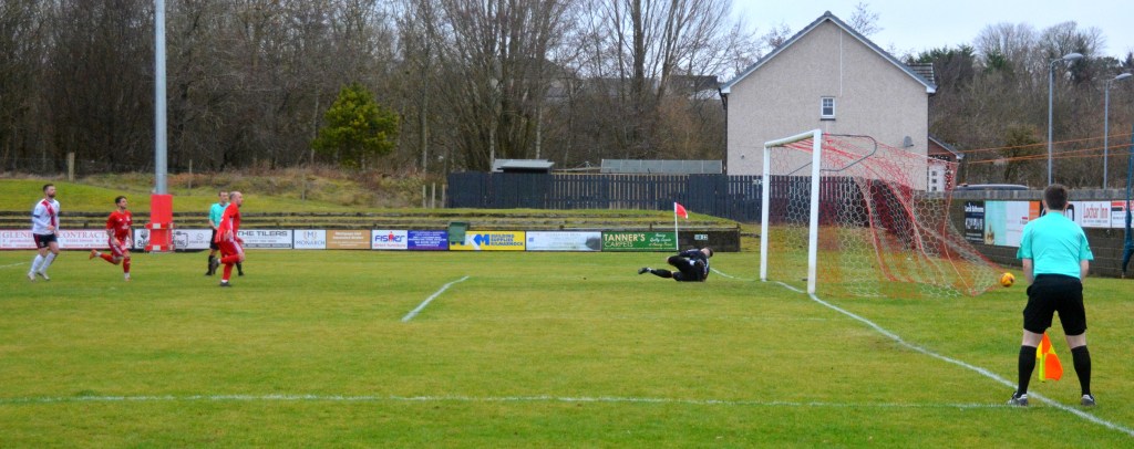 However, on 55 minutes the Glens pressure paid off. Moffat, from inside the Bankies half, slipped the ball forward to Caddis who cutely side-footed it to McKee on the overlap down the right wing to drive to the bye-line. From there the winger rolled the ball back to Paton to thread a diagonal ball between Truesdale and McMahon into the box where Moffat gathered the ball only to be tripped from the back by Frazer Johnstone. It was Michael Moffat that stepped up to send Donnelly the wrong way and tuck the penalty-kick into the corner of the net.