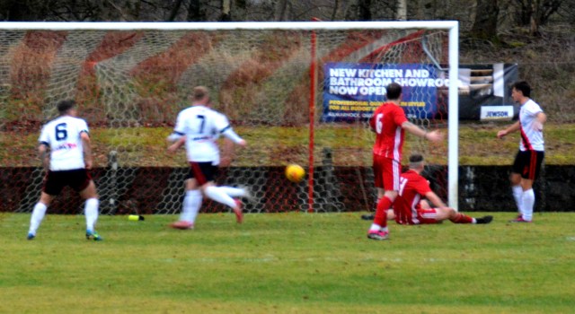 Glens then pressed again and on 81 minutes drew level for the second time. McLean, from just inside the Bankies half, floated a ball high into the box where Rowe managed to get in front of Niven as it dropped into the six-yard box his attempt to slide it home from 2 yards was blocked by Donnelly, only for Luke McBeth to get the jump on McMahon and guide the loose ball home from 3 yards beyond the reach of the grounded goalie. (too dark for my camera)