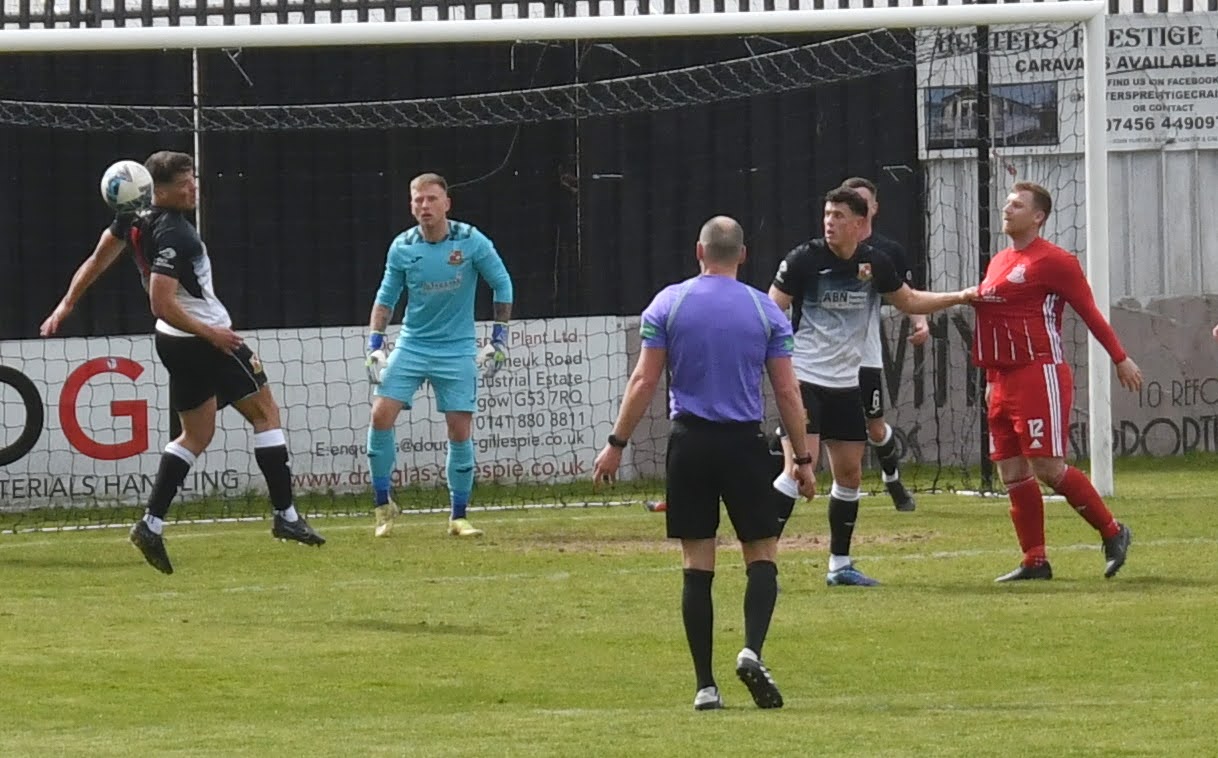 On 64 minutes O’Kane broke the down the right and his cross out for a corner. Gilmour floated the kick into the box where it went beyond Caddis possibly because Findlay had a fistful of the Glens striker’s shirt, in front of the referee, but no action taken!