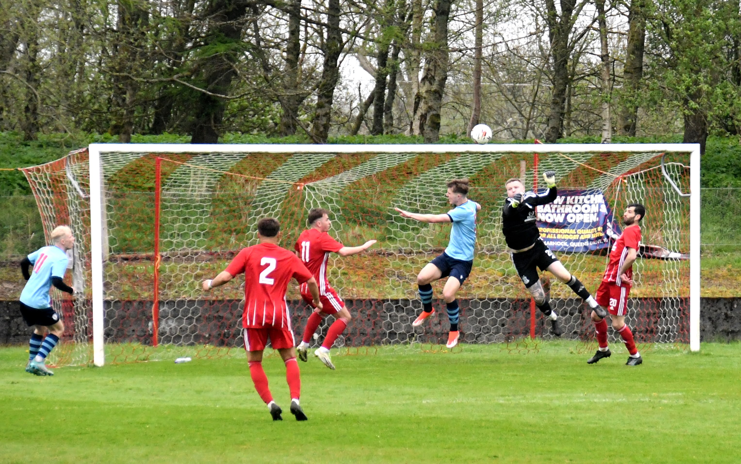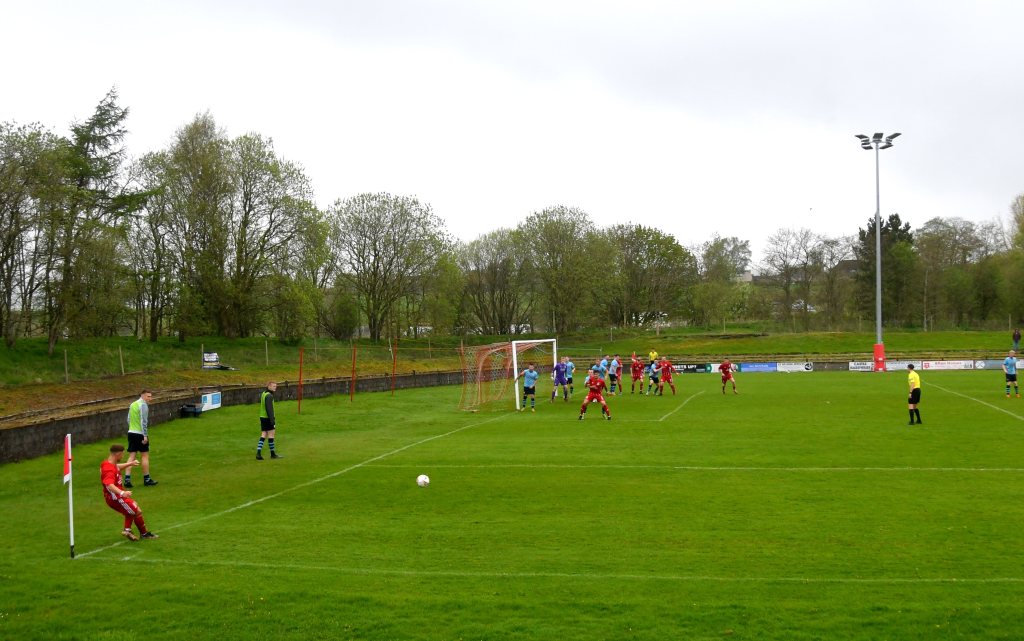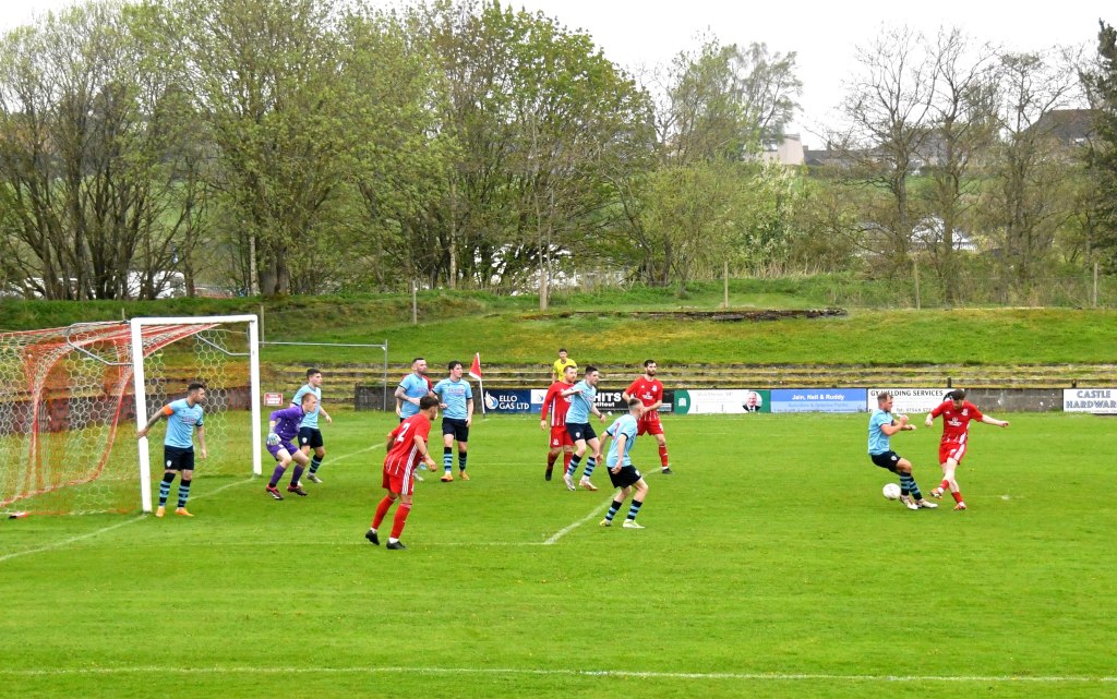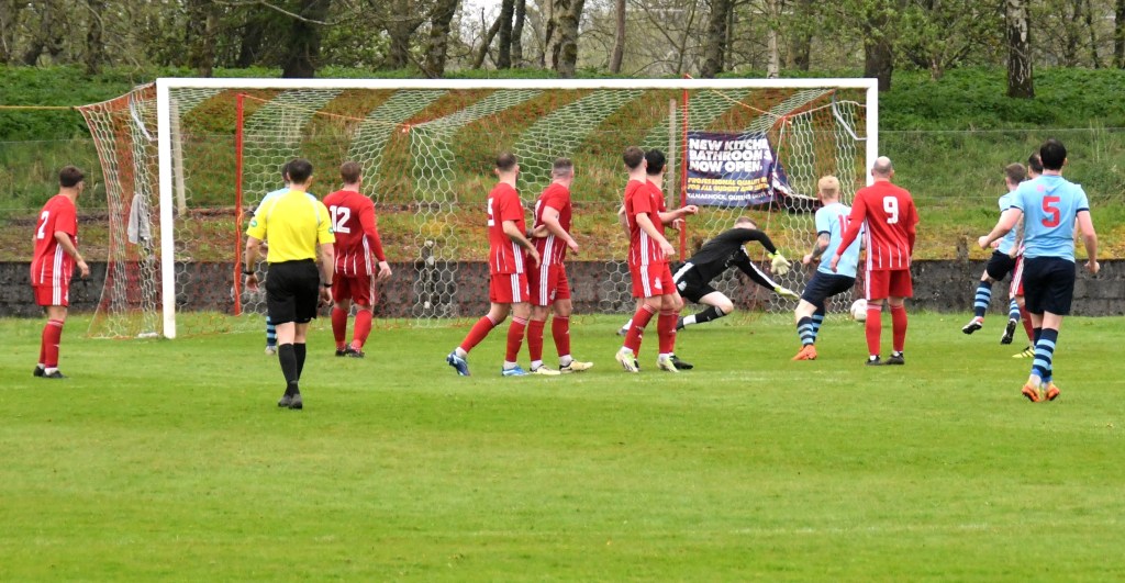 Back at the other end Kerr was barged in the back as he approached the ‘D’ from where Fraser blasted a shot past the Rabs wall only for the keeper, 2 yards off his line, to leap and finger-tip the ball over the bar. O’Kane’s corner floated to the edge of the six-yard box where the determined Caddis won the aerial battle only his header ball to drift wide of the back post.
