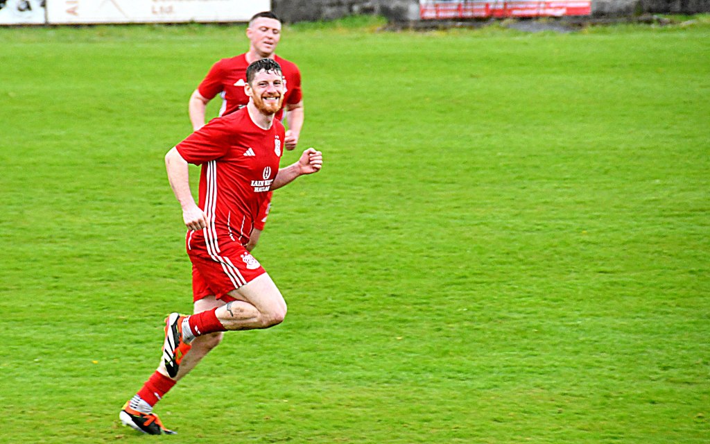 Shortly afterwards, another good run by No. 15 ended with Paton’s challenge at the edge of the box and he opted to take the free-kick himself only for Caddis on the right-hand side of the wall to meet it full on with a powerful header sending it high into the air and for Rowe to then head it clear for Ross to gather and break down the right where the Glens won a free-kick. Paton curled the kick to edge of the six-yard box where Caddis won the header but it deflected off Green for a corner which McKee floated into the goalmouth and Kerr’s header was cleanly clutched by the keeper.