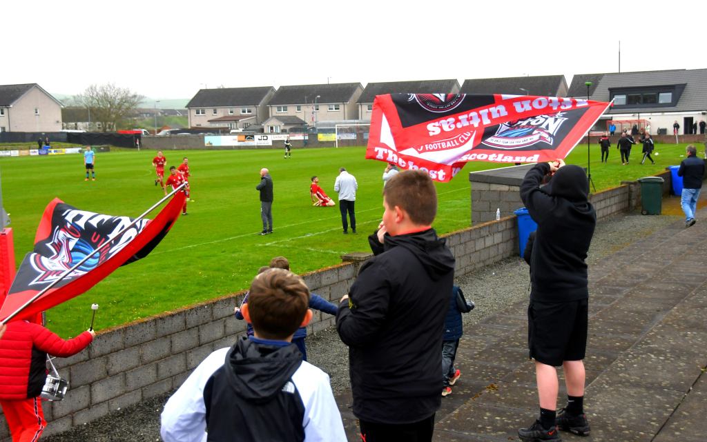 Kerr won a corner on the left and made his way into the box as O’Kane lined up the kick. Although the six-yard box was packed to the gunnells Kerr had drifted out at the far-end unnoticed and unmarked. Seizing the moment O’Kane drilled a low ball towards the penalty spot to match Kerr’s run where although No. 6 rushed out to close him down, the striker sweetly smacked the ball first time through a ruck of players and the narrow space between the keeper diving at full stretch and the captain on the post. The celebrations were rightly joyous on and off the park, the Young Ultras doing their bit too!
