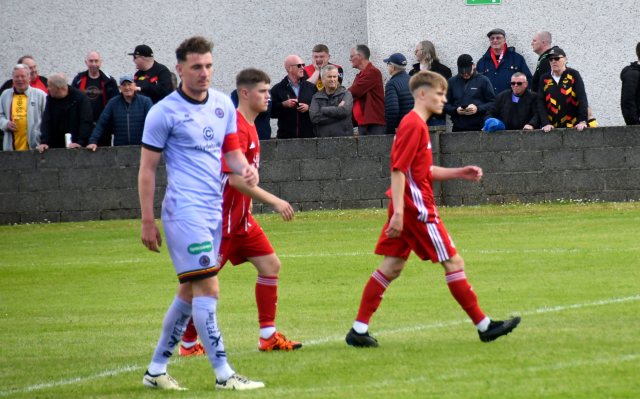 The Glens however, would have the final say on 87 minutes. O’Kane, in the centre circle, gathered the ball from O’Brien from where he weaved his way through the middle before being tripped by MacKay, some 25 yards from goal on the outskirts of the ‘D’. As before O’Kane and Lindsay lined up to take the free-kick and as before it fell to Lindsay who curled a low strike round the four-man wall and although the keeper got down to low to get two hands to it the ball shot up into the air, the alert Aaron Carmichael was first to react and guide the ball past the rising keeper and into the net.