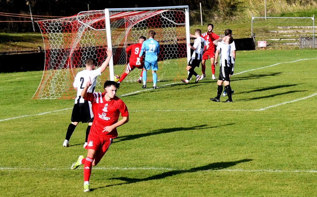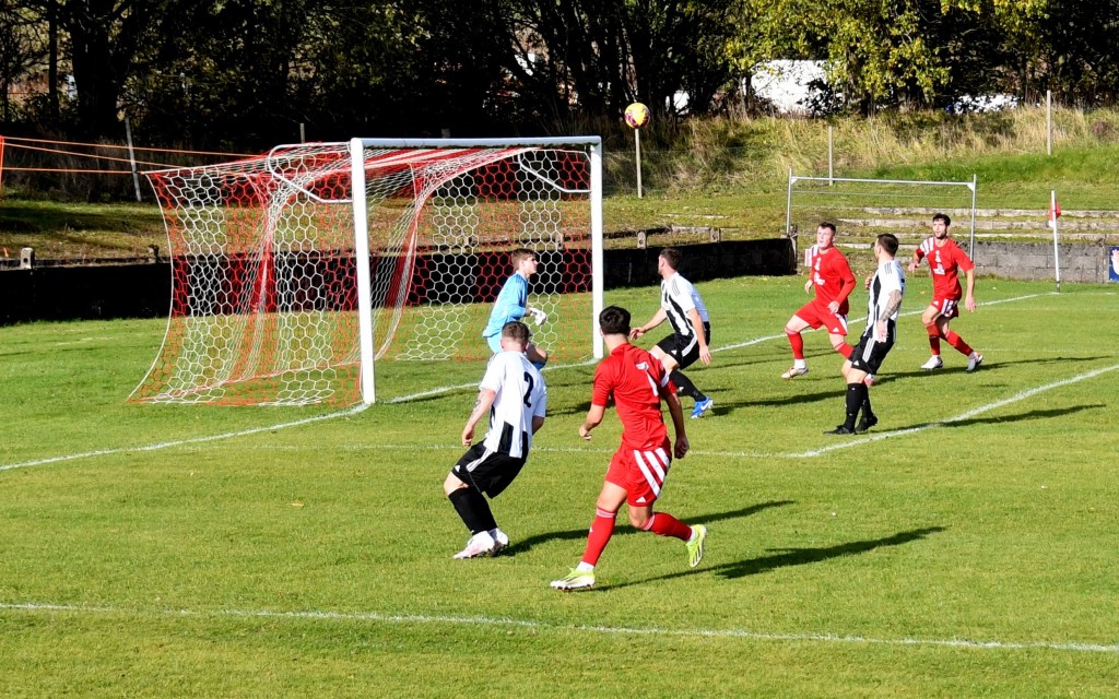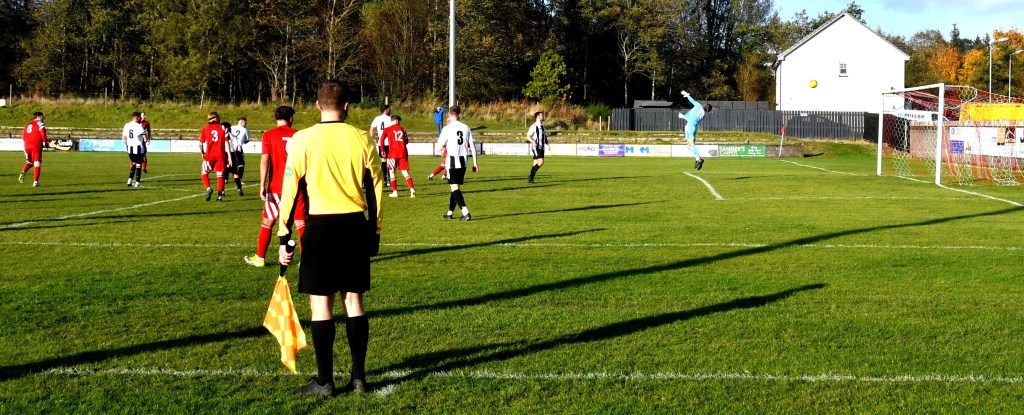 Back came the home side and won a corner on the left only for the keeper to come off his line to clutch the ball cleanly. McKee then broke down the right to win a throw a few yards from the corner-flag which he lobbed high into the heart of the box where the ball was eventually scrambled cleared and fell at the feet of Ross Lindsay at the edge of the ‘D’ from where his sweet strike sailed inches above the reach of the keeper’s finger tips as he leapt high from the six-yard line with his arm at full stretch and he could only look on as the ball dipped inches under the bar and into the gaping net. Glens 2-0 up on 70 minutes.