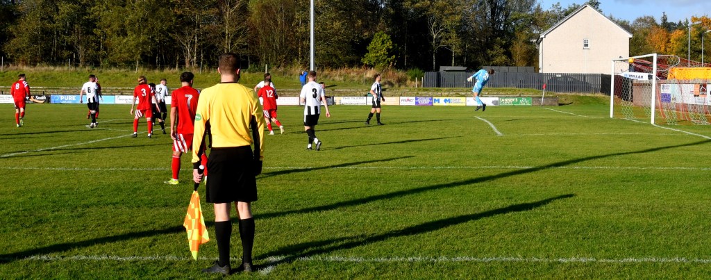 Although the Glens kicked off it was the visitors that made a lively start. No. 10 weaved his way past a clutch of defenders into the right-hand side of the box before squaring the ball to the inrushing No. 9 only for his shot to be blocked by Lyall Holding, sending the ball over the bar. The corner kick was cleared from the box but fell for No. 6 and his low shot from distance was deflected high over the bar. for another corner which came to nothing. Soon after the visitors were left feeling aggrieved after a quick break down the left leaving the winger with seemingly a free run into the goalmouth only for a late offside flag to bring play to a halt, looked like a let-off for the Glens.