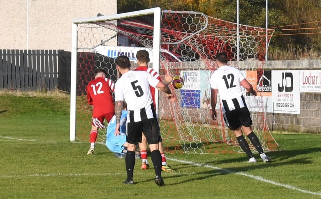 At the other end Deveronside won a free kick on the outskirts of the Glens box which was curled round the side of the Glens wall forcing keeper Ally Semple to get down low on the goal line and push it away towards the right touch-line where No.7 won the race for the loose ball and whipped a wicked cross deep into the six-yard box where Semple under pressure from No.4 clutched it cleanly, before being ‘nudged’ over the goal-line.