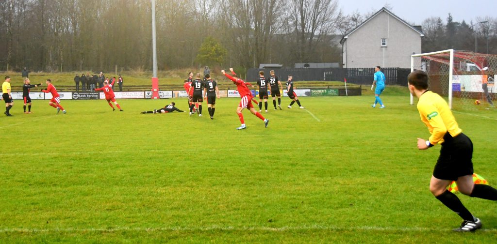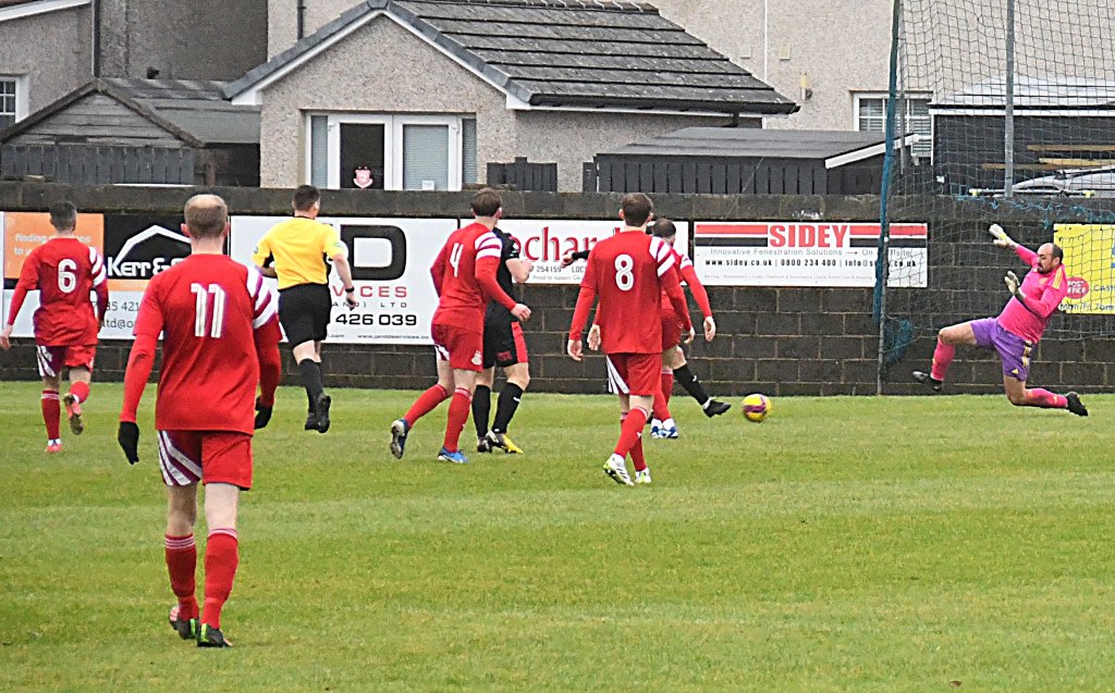 At the other end Bankies won a free-kick some 10 yards from the 18 yard-line from where Gallacher clipped it over the 4-man wall into the heart of the goalmouth only for Syme’s header, under pressure from Pettigrew, to fly well-wide of target.