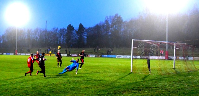 On 14 minutes Cieran Mulcahy broke down the left before cutting inside, 10 yards short of the bye-line, chipped the ball into the goalmouth and although it was just too high for Lee Gallacher and his guard Jared Willet at the nearside post it took a bounce in the six yard box and fell nicely for the inrushing Nicky Little as keeper David Markey scurried along his line, Little clipped it over his outstretched leg only for the ball to crash off the post.