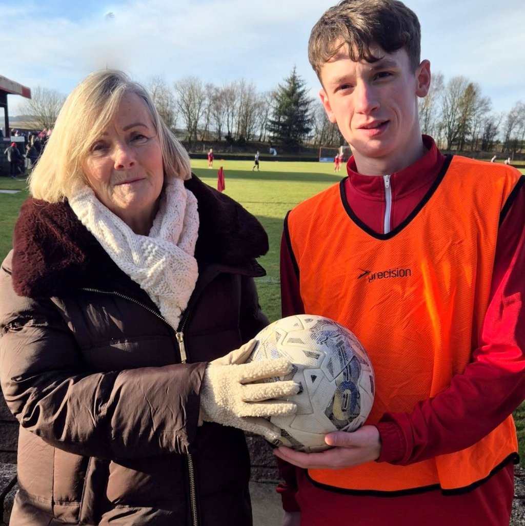 Massive thanks to Marie Walker for sponsoring the match ball for yesterday’s match.Marie sponsors the match ball each year in memory of her husband and lifelong Glens fan Jim Walker.Marie is pictured before the match, with Darren Jamieson from Glenafton U20’s who was part of yesterday’s match day squad.Thanks again Marie.